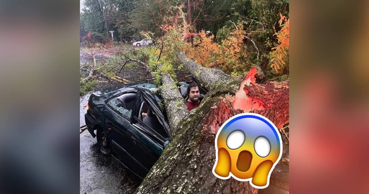 Un homme échappe à une mort certaine quand un arbre tombe sur sa voiture alors qu’il sortait la tête par le toit ouvrant