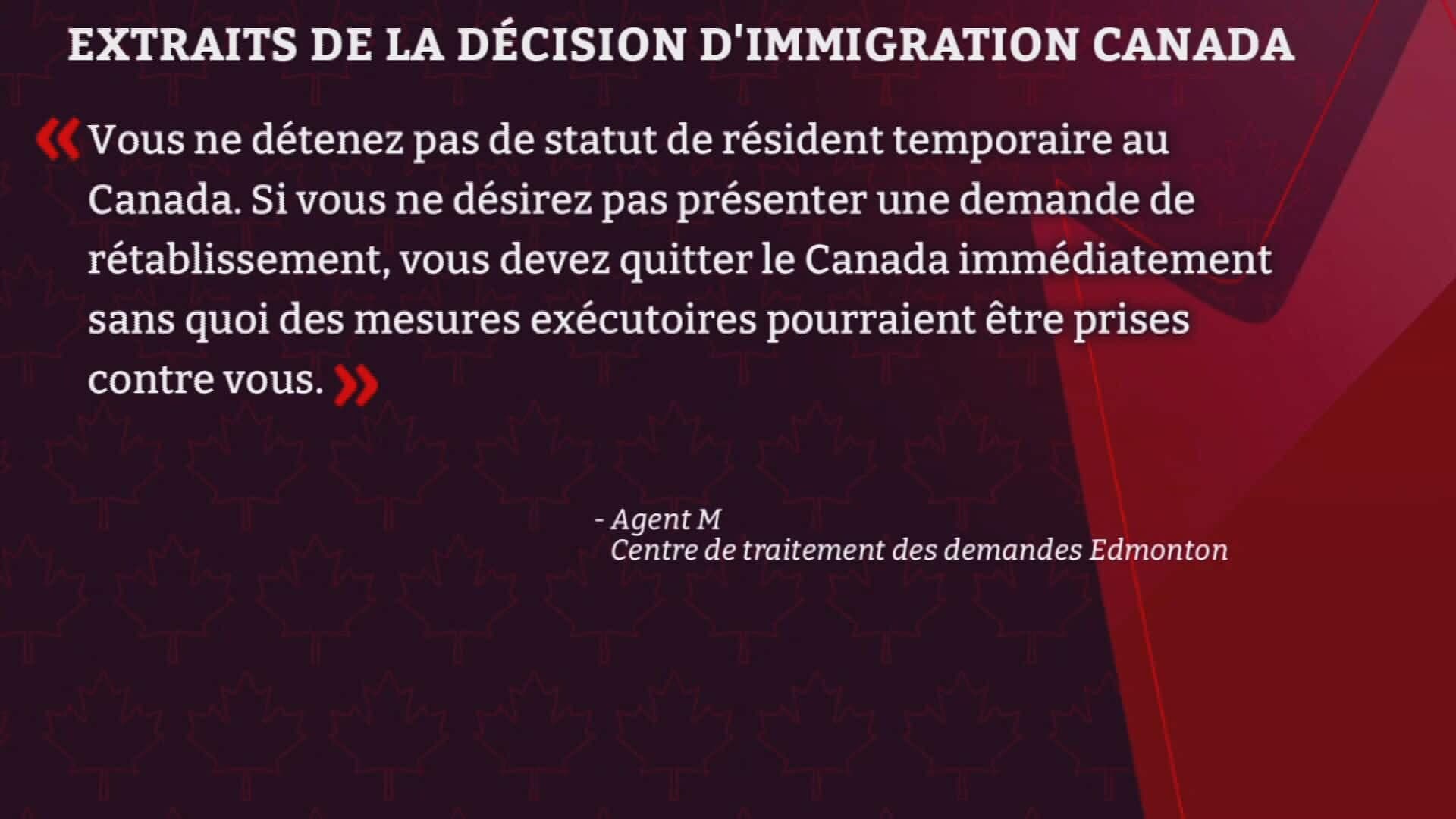 «Vous ne détenez pas de statut de résident temporaire au Canada. Si vous ne désirez pas présenter une demande de rétablissement, vous devez quitter le Canada immédiatement sans quoi des mesures exécutoires pourraient être prises contre vous.»