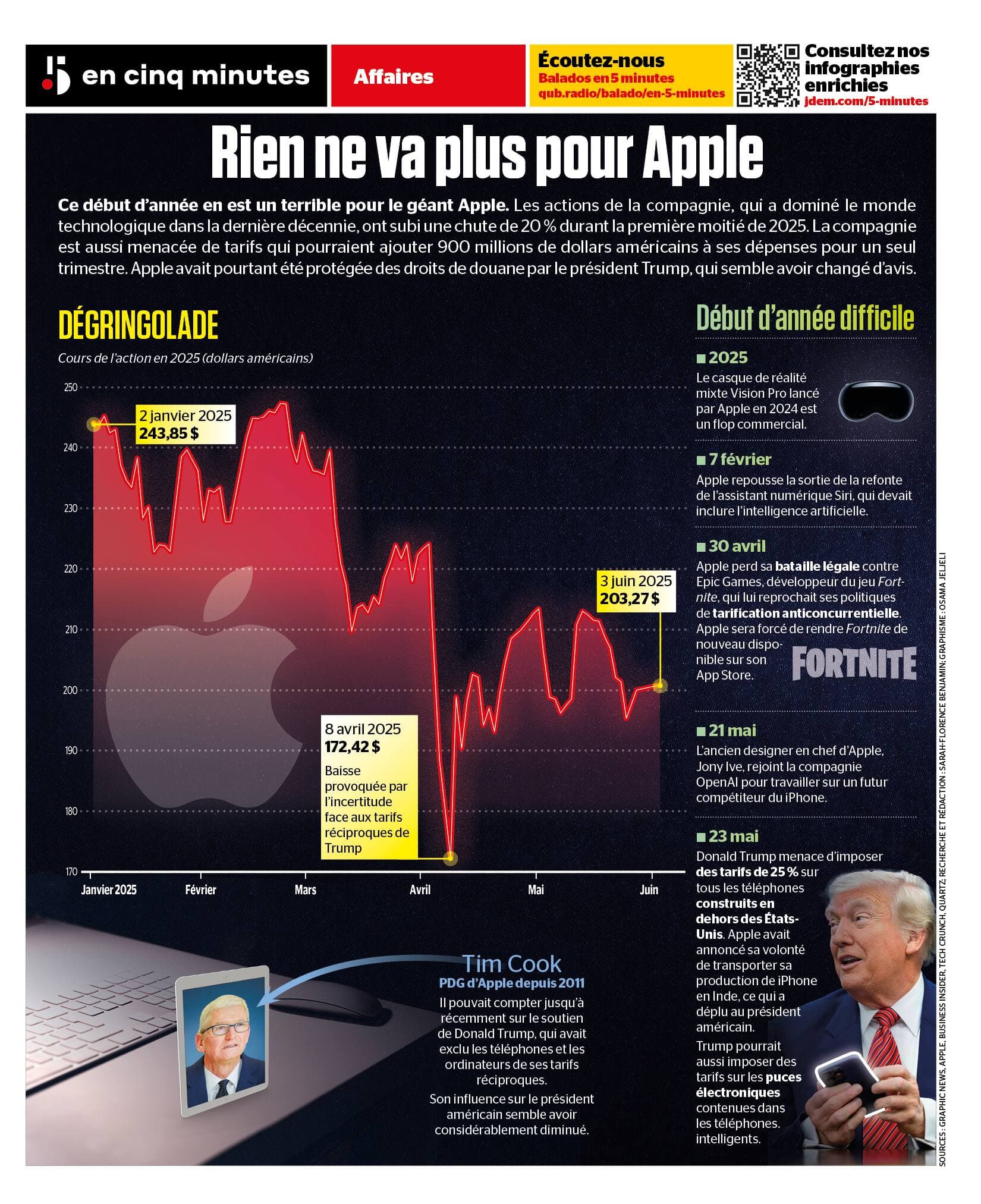Les actions de la compagnie, qui a dominé le monde technologique dans la dernière décennie, ont subi une chute de 20 % durant la première moitié de 2025. La compagnie est aussi menacée de tarifs qui pourraient ajouter 900 millions de dollars américains à ses dépenses pour un seul trimestre. Apple avait pourtant été protégée des droits de douane par le président Trump, qui semble avoir changé d’avis.