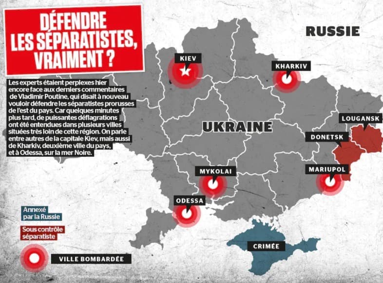 L’attaque a commencé à l’aube, après que Vladimir Poutine eut reconnu lundi l’indépendance de territoires séparatistes ukrainiens du Donbass, puis fait valider mardi une intervention militaire par le Parlement russe.