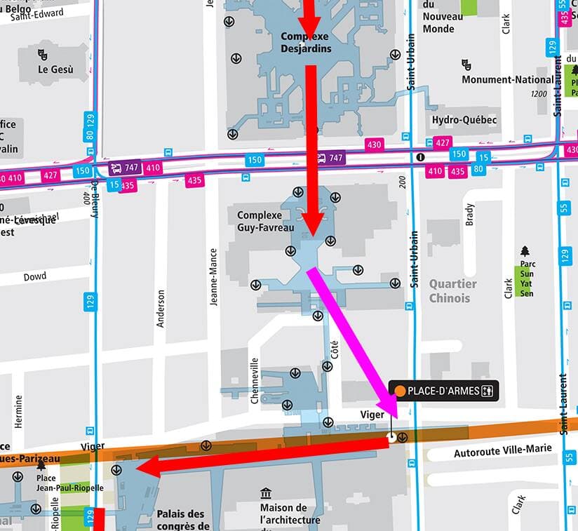 - Mon trajet m’a forcé à sortir dehors pour marcher environ 400 m entre le complexe Guy-Favreau et le Palais des Congrès, puisque le passage intérieur était temporairement fermé. Sinon, il aurait été possible de rester au chaud toute la journée. Cela dit, il existe d’autres secteurs, comme les galeries autour du métro Berri-UQAM, qui font officiellement partie du RÉSO, mais qui ne sont pas connectées ensemble par voie piétonne.