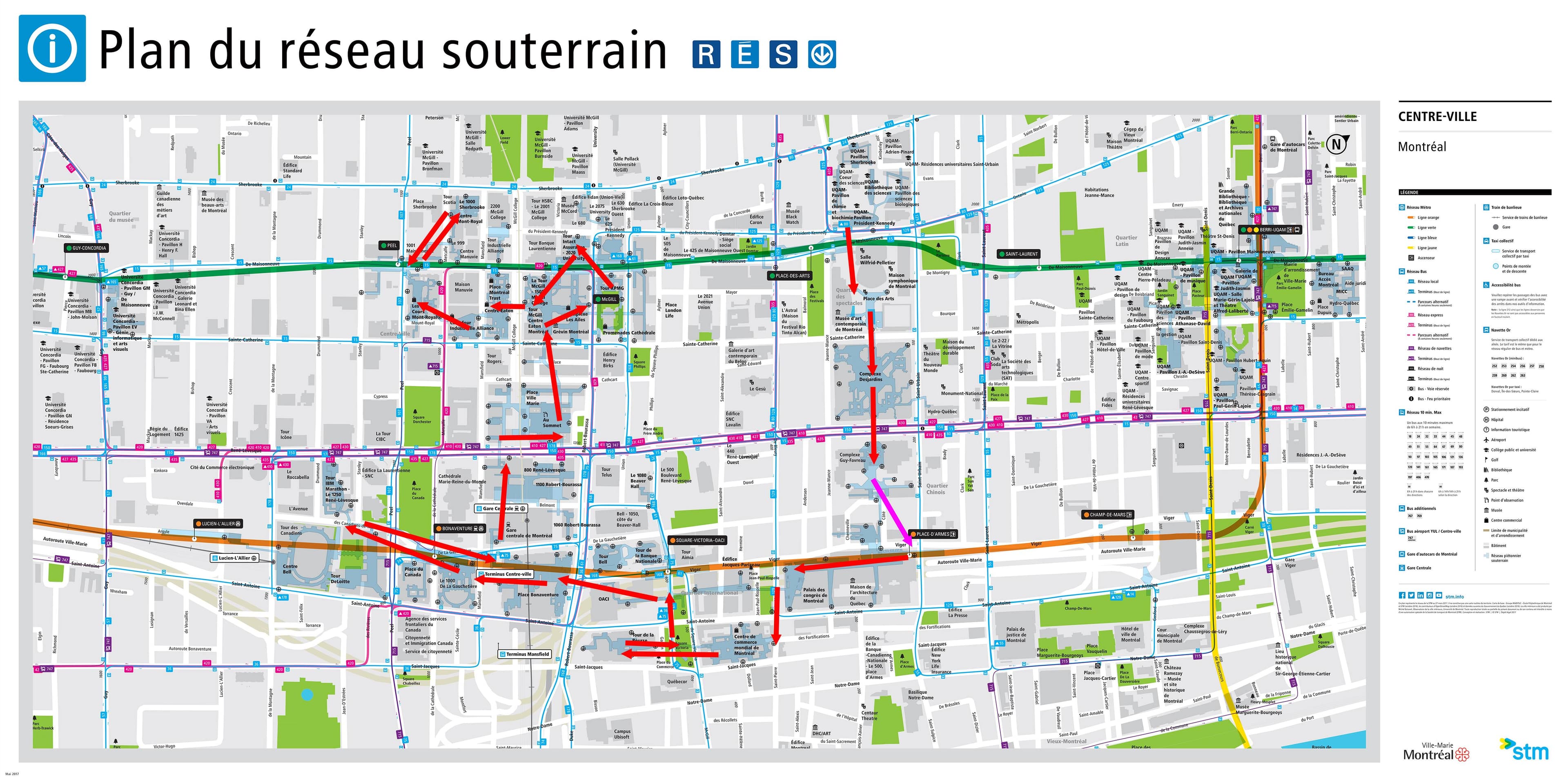 Ma suggestion est de commencer par l’extrémité nord-est du RÉSO, c’est-à-dire à la station de métro Place-des-Arts. Comme ça, si vous succombez à l’envie de vous acheter une paire de bottes ou un nouveau robot culinaire, vous n’aurez pas à le traîner toute la journée, puisque vous garderez les zones axées sur le magasinage pour la fin.