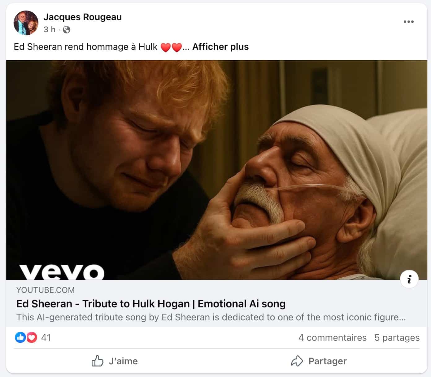 Vendredi matin, le lutteur Jacques Rougeau a partagé une vidéo d’une chanson attribuée à Ed Sheeran, censée rendre hommage au défunt Hulk Hogan.