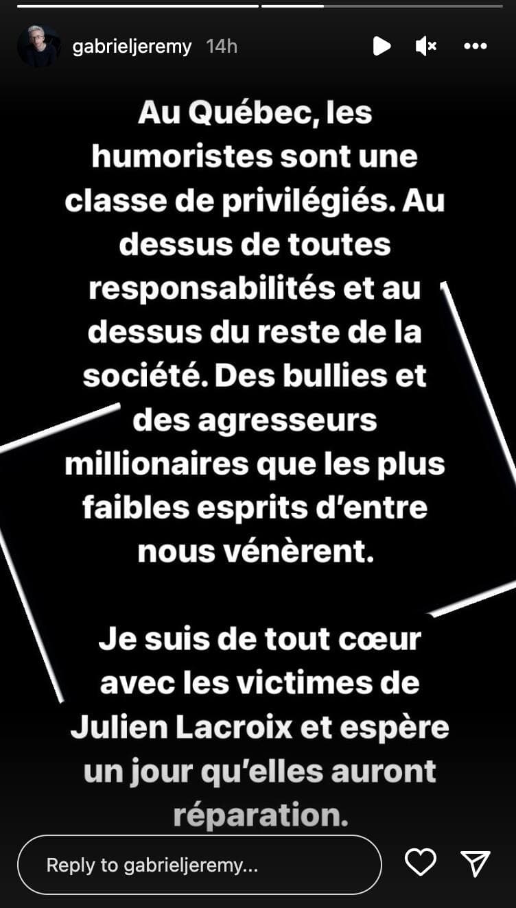 «Je suis de tout coeur avec les victimes de Julien Lacroix et espère un jour qu’elles auront réparation.»