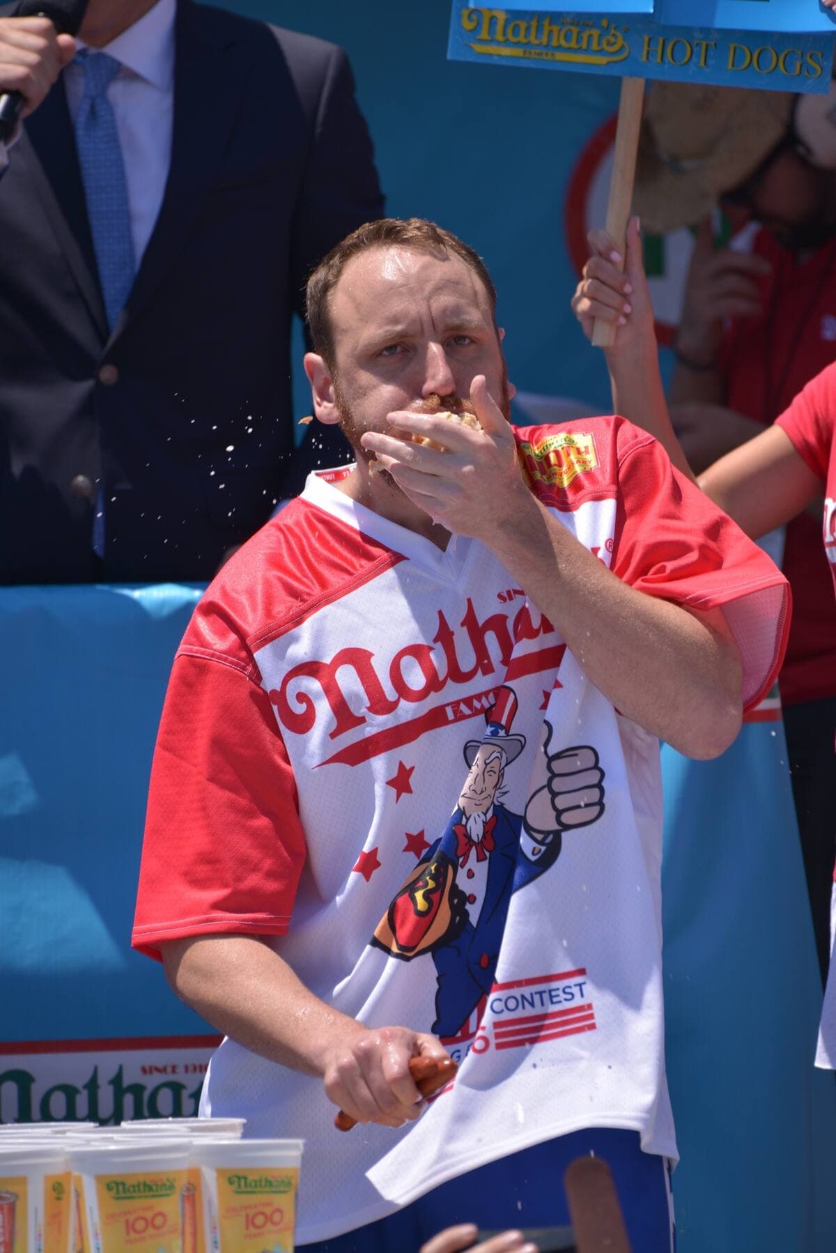 Il y a quelques jours, Chestnut n’a pu défendre sa couronne au concours du 4 juillet, car il a été écarté d’amblée pour avoir fait la promotion de saucisses véganes, ce qui est interdit par l’organisation de la compétition. En 2021, il a établi une marque en consommant 76 hot-dogs en 10 minutes.