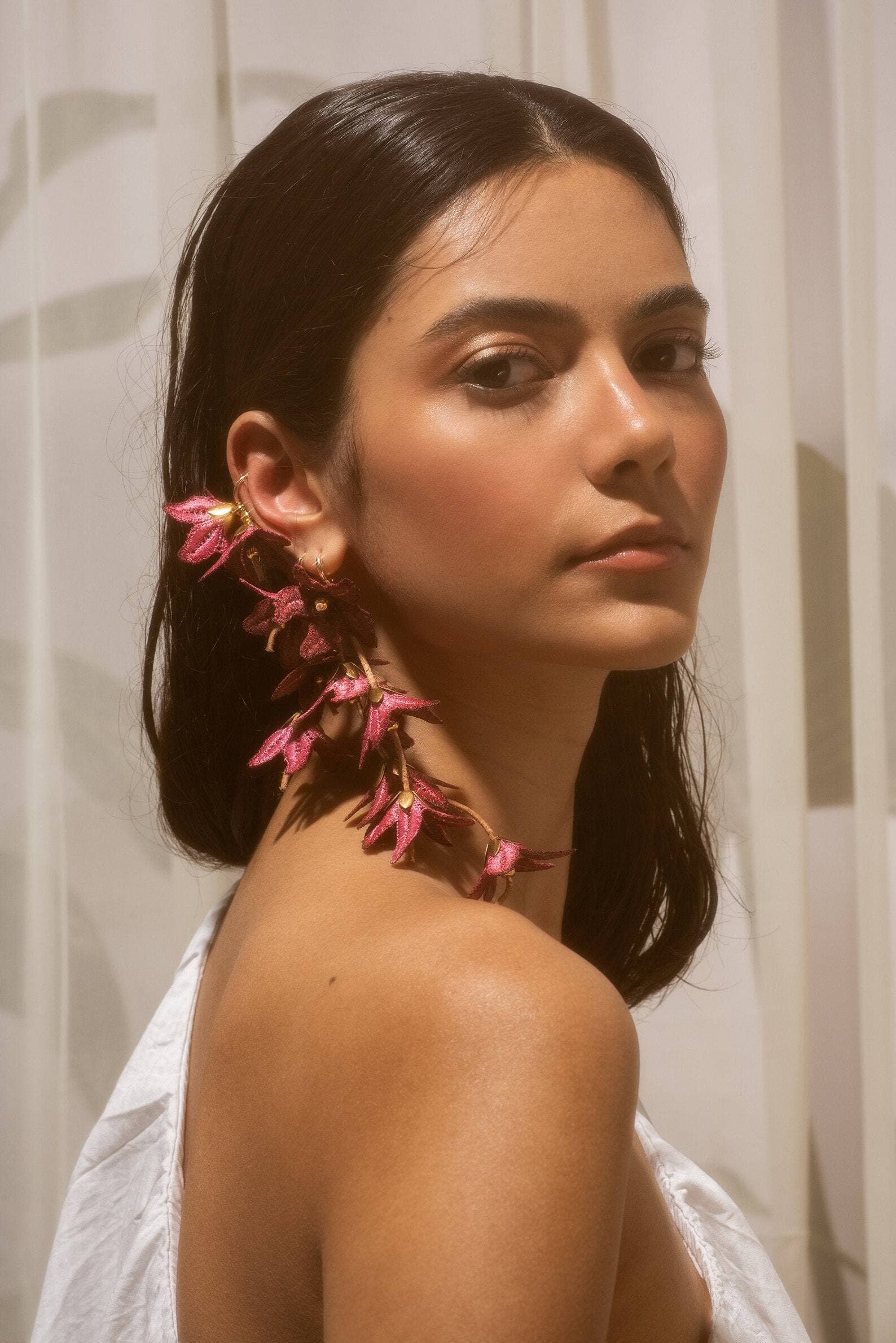 Diplômée en design industriel, la Montréalaise Tamara Bavdek a fondé Thisilk à la fin de 2008, après avoir conçu sa première paire de boucles d'oreilles en dentelle en 2006. Composé de dentelle vintage teinte à la main et soigneusement cousue dans des fleurs en trois dimensions liées par un cordon de cuir brut, de pièces en laiton et de perles en bois, cet ensemble de trois boucles d'oreilles légères est inspiré d'un art perfectionné dans les îles du Pacifique, où les fleurs sont portées pour s'exprimer. Une vraie oeuvre d'art!