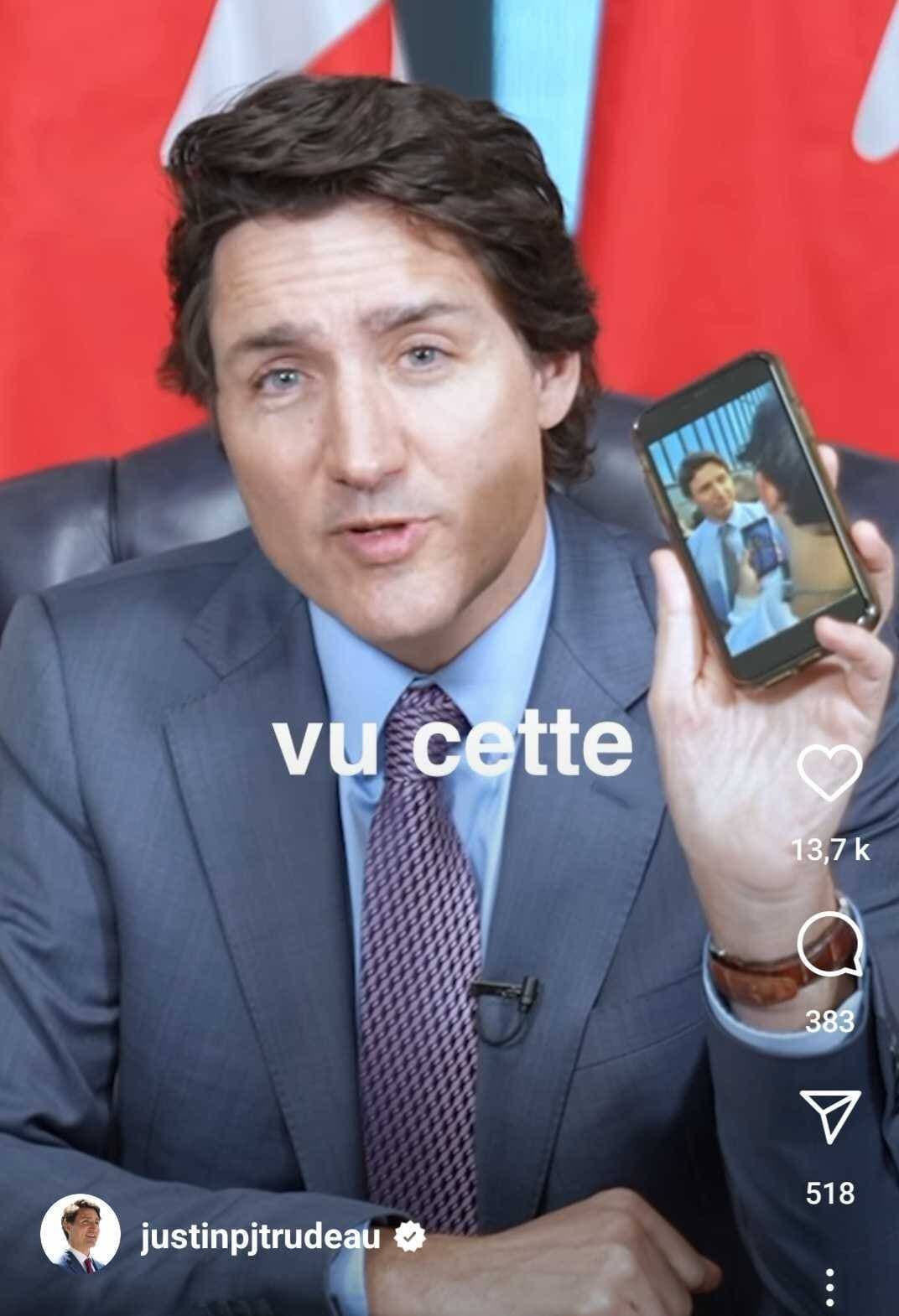 «Vous avez peut-être vu cette vidéo dernièrement», demande Justin Trudeau, tenant son téléphone qui fait défiler une partie de ces images. Il explique qu’il a reçu, à la suite du dévoilement de ce segment viral, une série de messages, de commentaires et de suggestions de ses supporteurs lui disant qu’il aurait pu utiliser tel ou tel argument à l’occasion de cet échange.