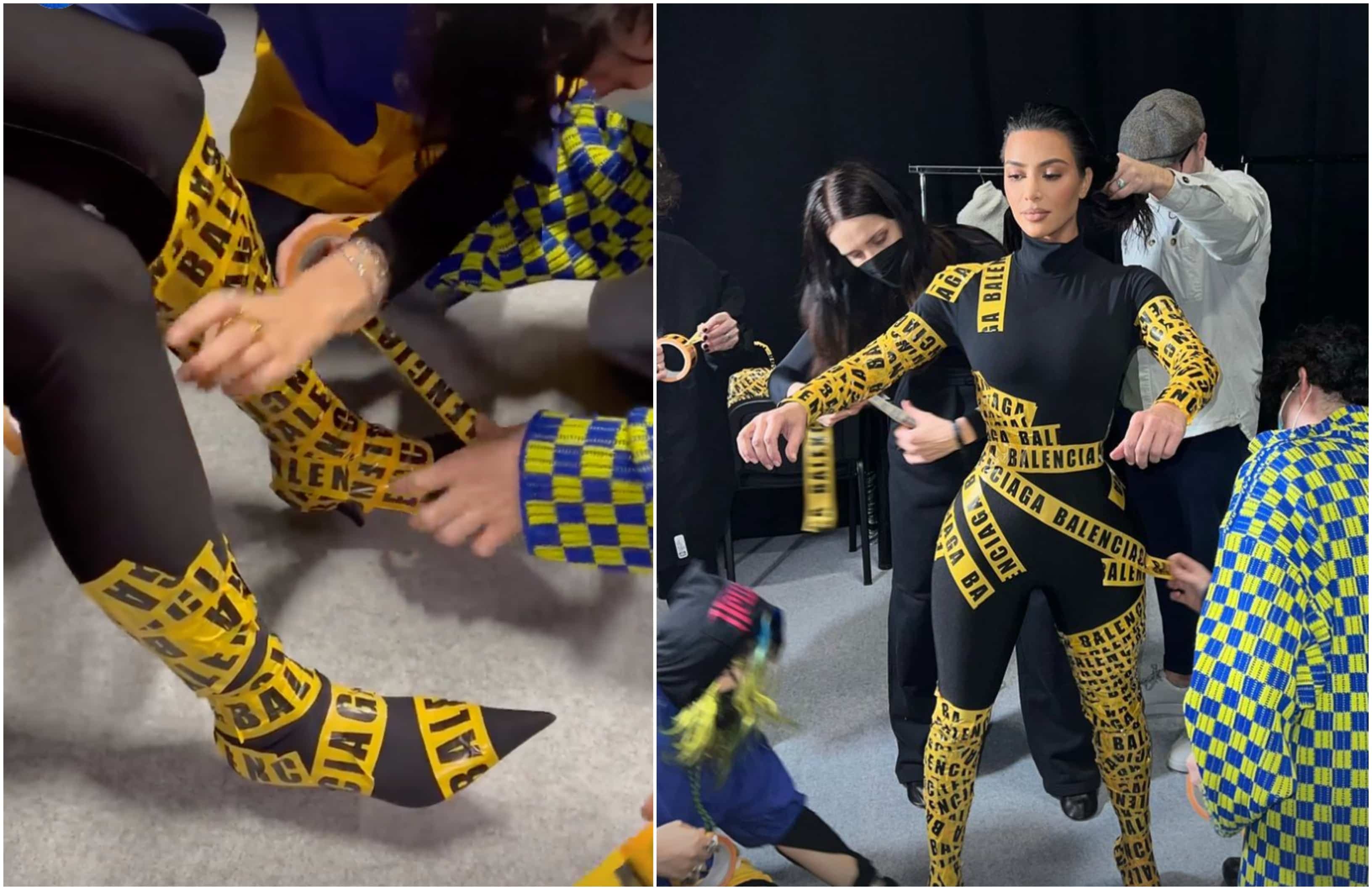 Kim Kardashian couverte de ruban adhésif Danger pour le défilé Balenciaga
