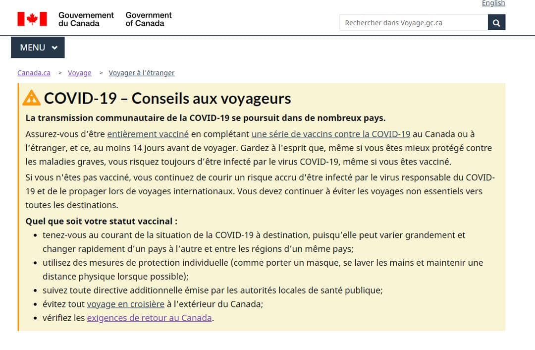 La section sur les conseils offerts concernant la pandémie de COVID-19 reste en place. Ainsi, Ottawa recommande toujours de se tenir au courant de la situation liée à la COVID-19 à la destination choisie.