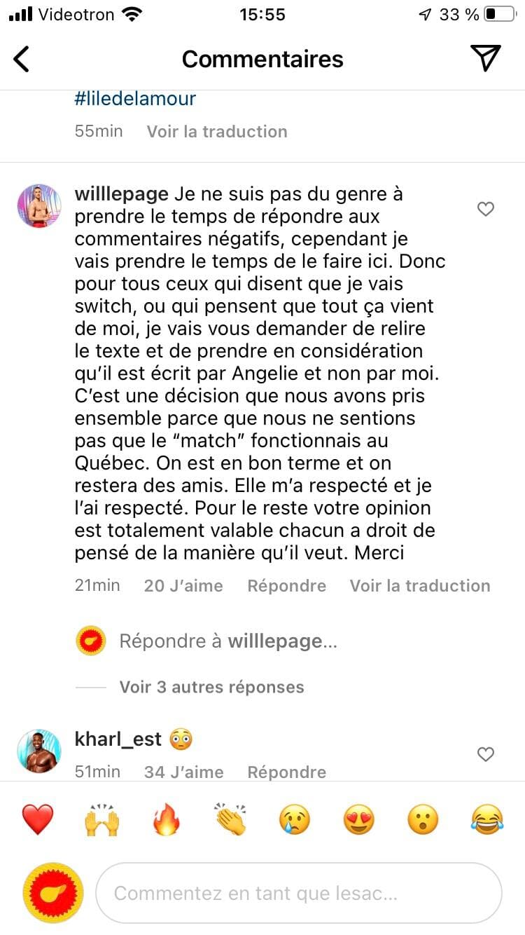 «William et moi avons pris la décision de nous séparer et de continuer nos chemins chacun de notre côté. Nous avons réalisé que nous n’étions pas compatibles amoureusement et que c’était mieux pour nous de mettre un terme à notre relation. Par contre, nous sommes en très bons termes et sommes très sereins par rapport à la situation. Nous espérons tout de même garder une belle relation d’amitié», explique Angélie.