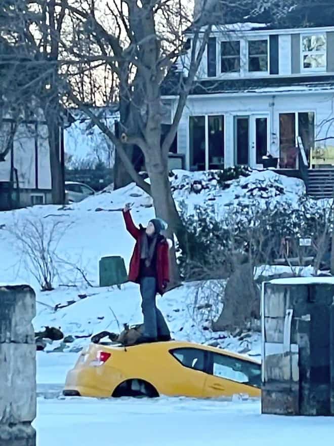 La glace a craqué, le bolide a plongé dans l’eau et la dame s’est réfugiée sur le toit de son auto... où elle s’est prise calmement en selfie, pendant que sa voiture coulait et que des gens se précipitaient pour lui porter secours !