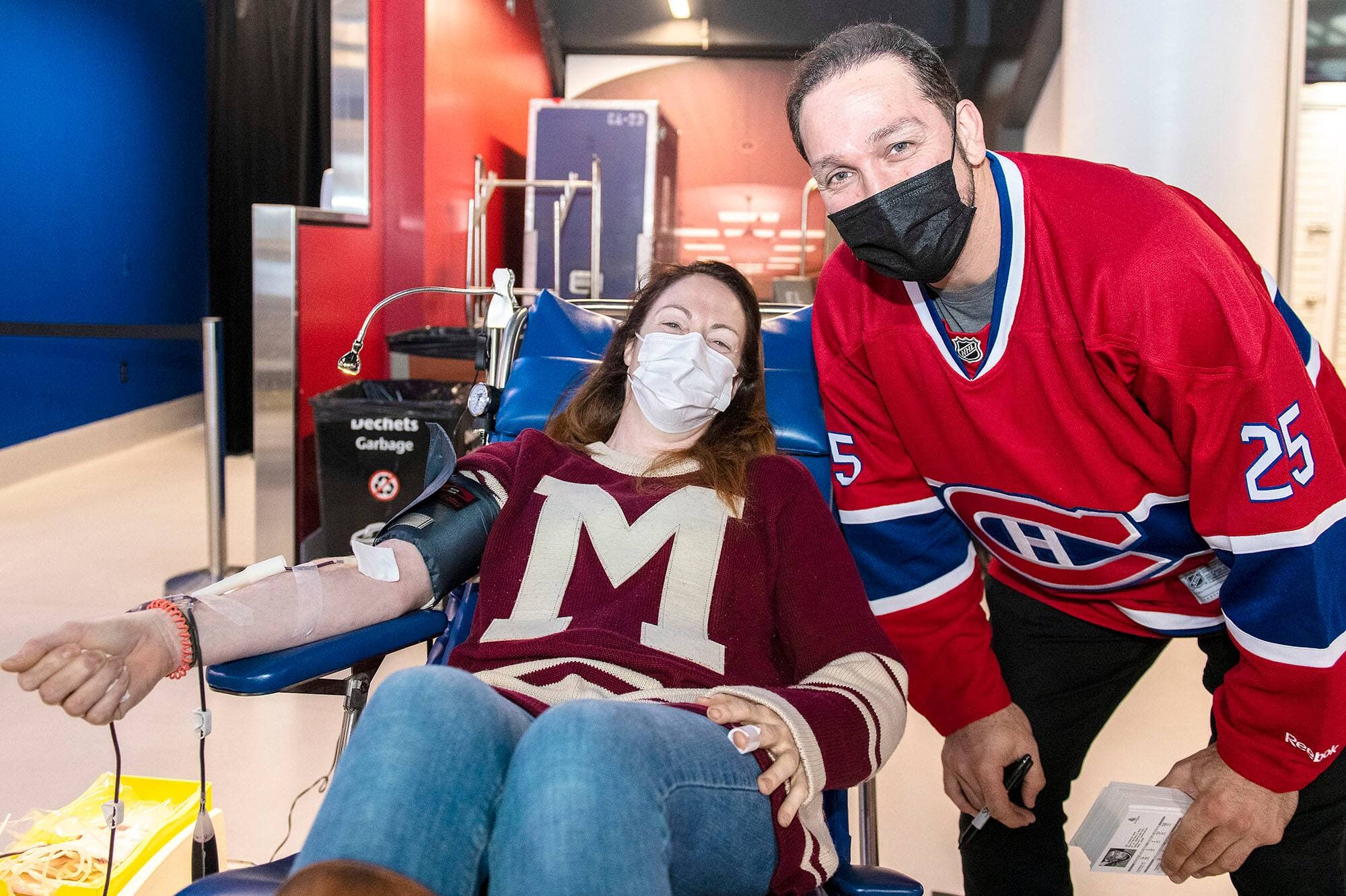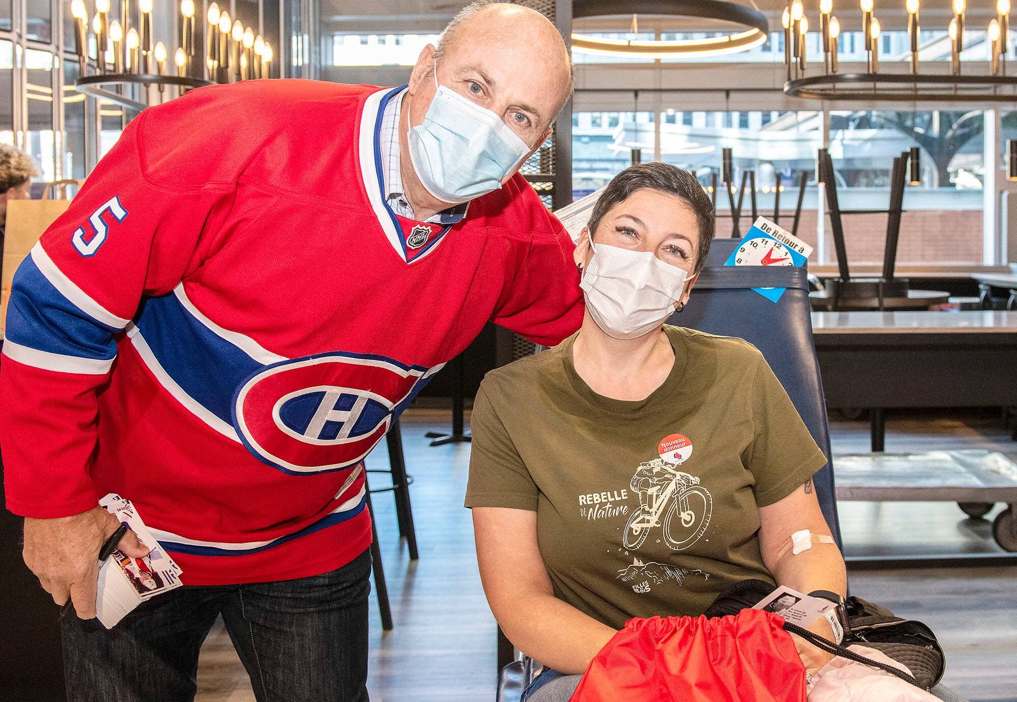Valérie Lafontaine, qu’on aperçoit en compagnie de l’ancien défenseur, Rick Green, a fait son premier don de sang.