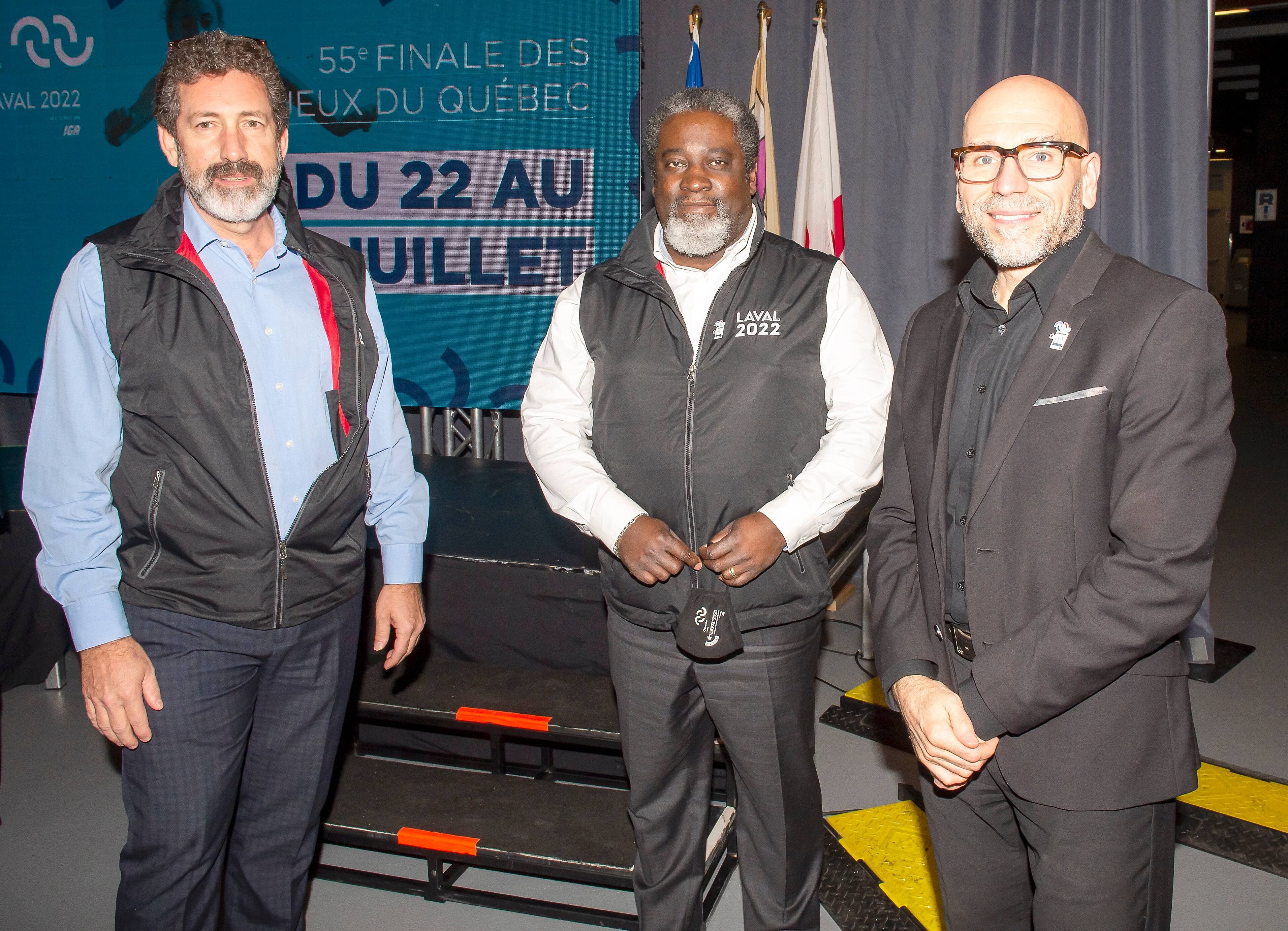 Michel Allen, de la Ville de Laval, est en compagnie de Jacques Ulysse, DG de la Ville de Laval, et de Sylvain Croteau, de Sport’Aide.