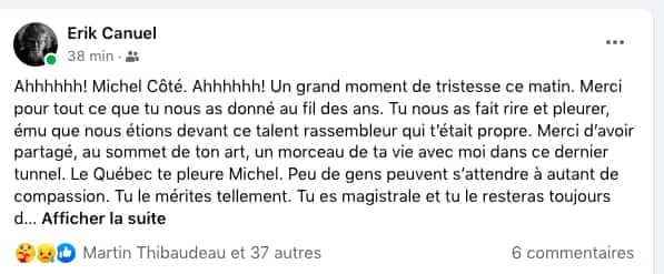 «Michel Côté était l’une des grandes personnes qu’on a eues dans le domaine culturel, et je dirais aussi, dans la vie, point. Il était généreux, sensible et drôle. C’était le genre d’homme qu’on voulait tous avoir chez nous à Noël, dans nos partys. Merci pour tout Michel!»