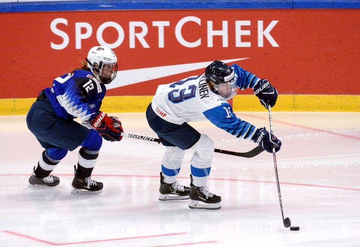 Caroline Ouellette contournant l'Américaine Kacey Bellamy aux Jeux olympiques de Sotchi, en 2014.