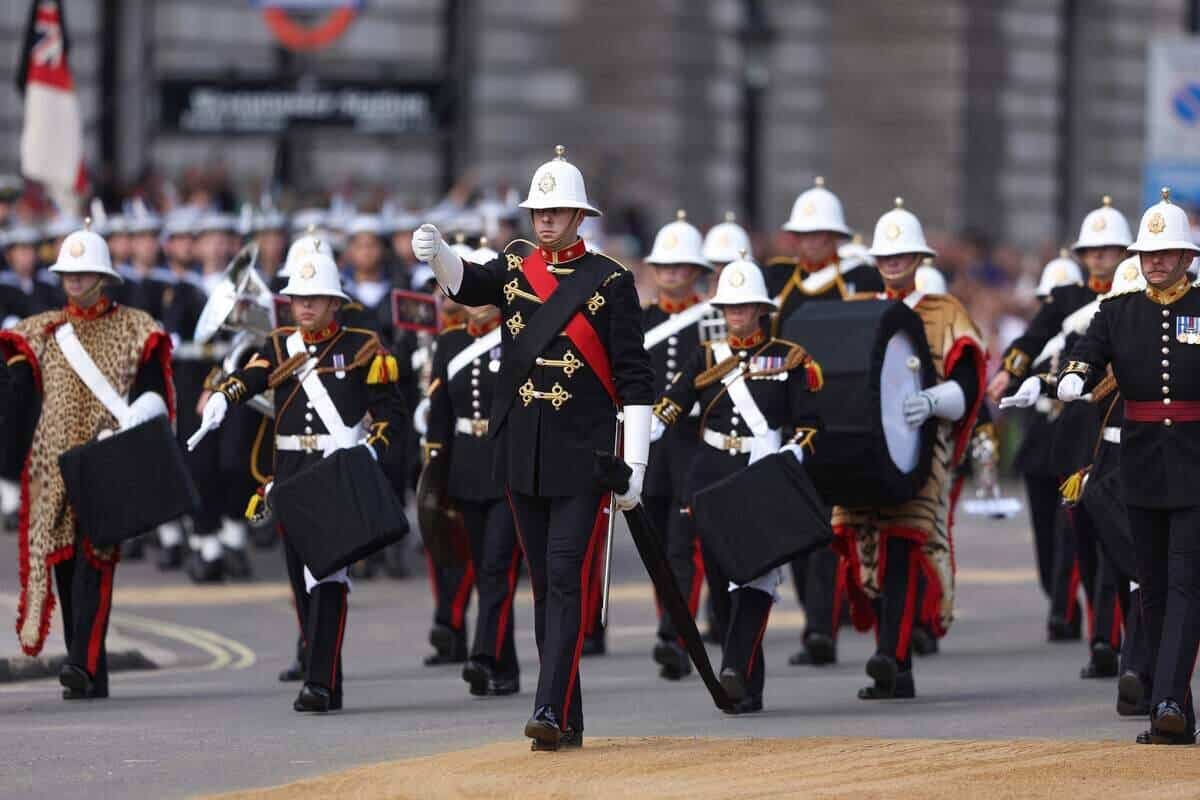 Après avoir quitté le palais de Buckingham sur un affût de canon tiré par des chevaux, le cercueil de la souveraine a été suivi à pied pour rejoindre Westminster, au rythme de 75 pas par minute, par ses quatre enfants, le roi Charles, la princesse Anne et leurs frères Andrew et Edward.