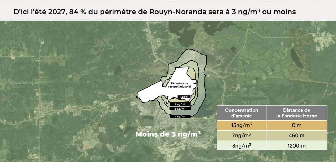L’entreprise soutient aussi qu’avec ces travaux, dans 97 % du périmètre urbain de Rouyn-Noranda, le taux d’arsenic sera de 7 ng /m3 ou moins et dans 84 % du périmètre urbain le taux d’arsenic dans l’air sera à la norme de 3 ng/m3.