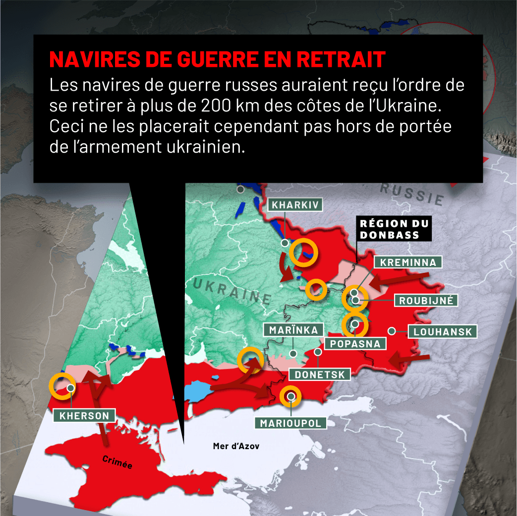 L’armée russe concentre ses attaques terrestres autour de trois villes : Marïnka, Popasna et Roubijné. Ces villes auraient été attaquées sur plusieurs fronts.