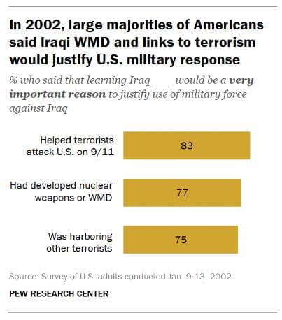 Parmi les faucons dans ce dossier, on retrouvait des poids lourds: George Tenet directeur de la CIA, le vice-président Dick Cheney ainsi que le premier ministre britannique Tony Blair. Il faut ajouter à cette liste de nombreux sondages qui pointaient en faveur d’un appui de la population américaine à une intervention militaire. C’est ce que rappelle ce tableau du Pew Research Center.