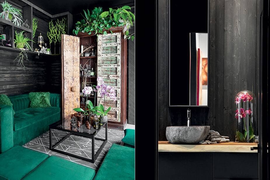 Le mur en bois teint noir mat apporte de la chaleur à la salle de bains du rez-de-chaussée. La pierre brute et lourde de la vasque tranche avec la délicatesse de l’orchidée protégée par une cloche en verre.