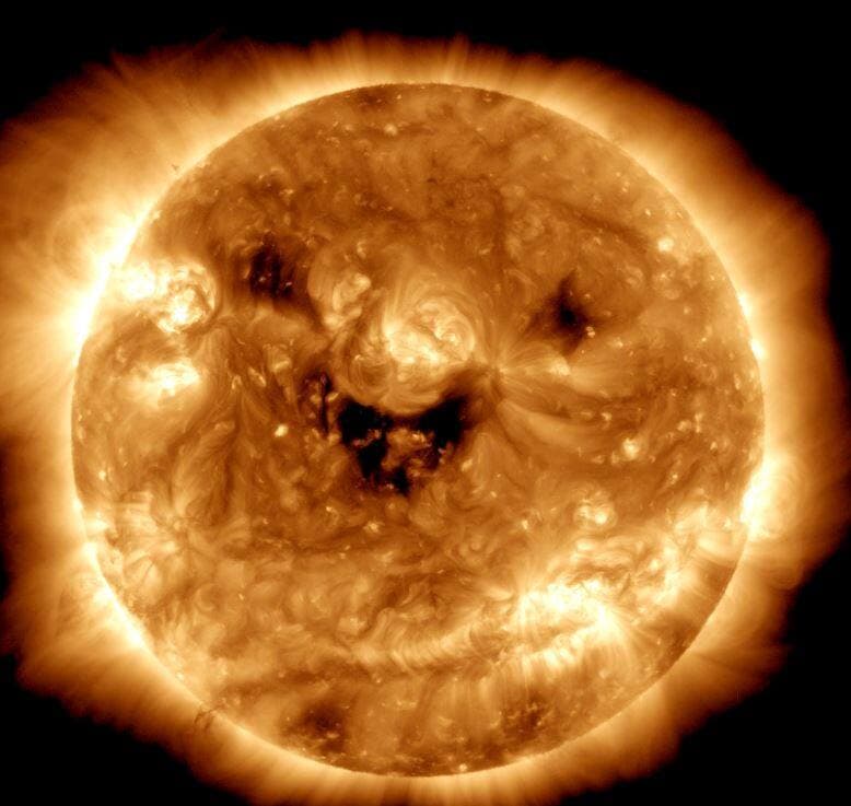 Today, NASA’s Solar Dynamics Observatory caught the Sun "smiling." Seen in ultraviolet light, these dark patches on the Sun are known as coronal holes and are regions where fast solar wind gushes out into space. pic.twitter.com/hVRXaN7Z31