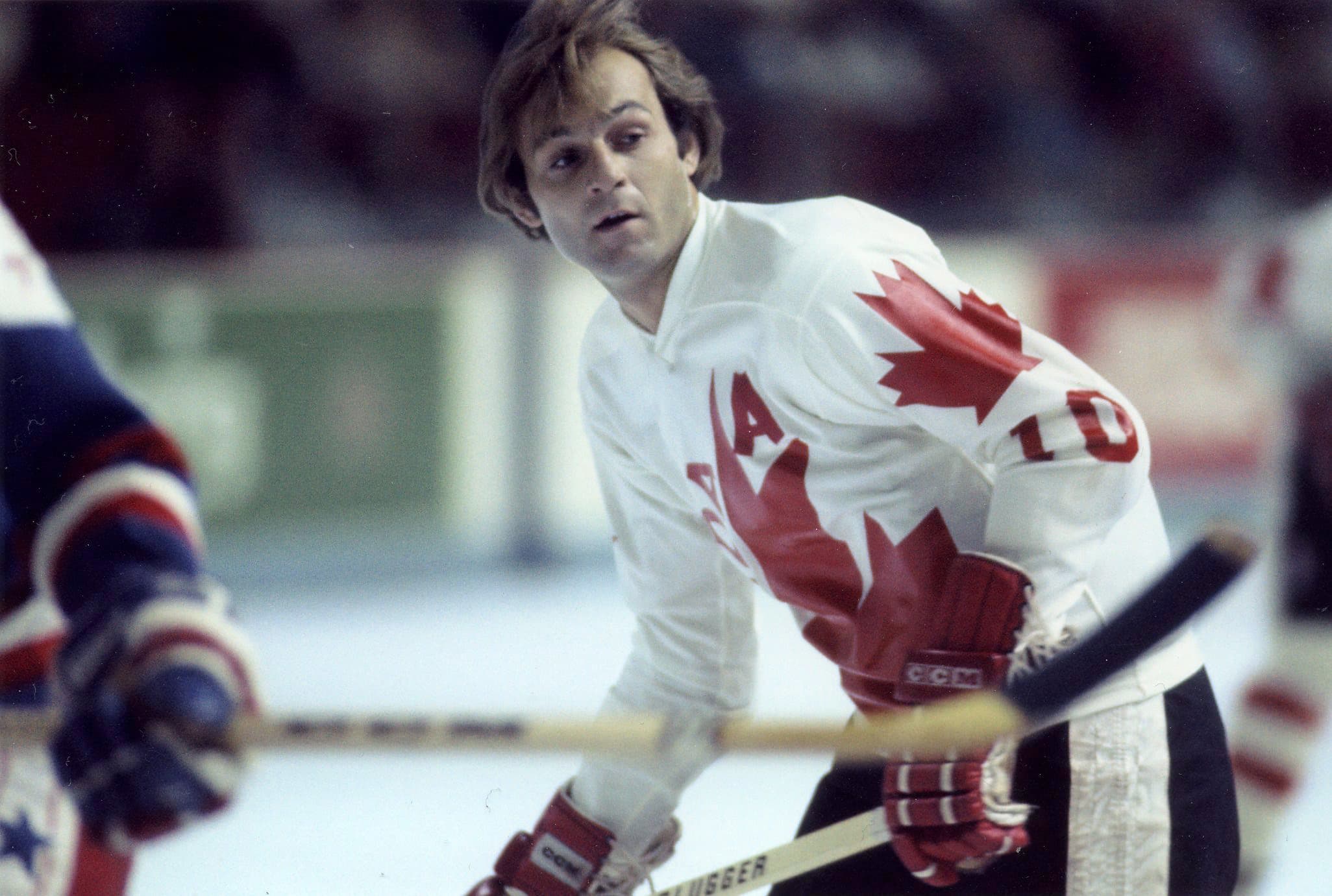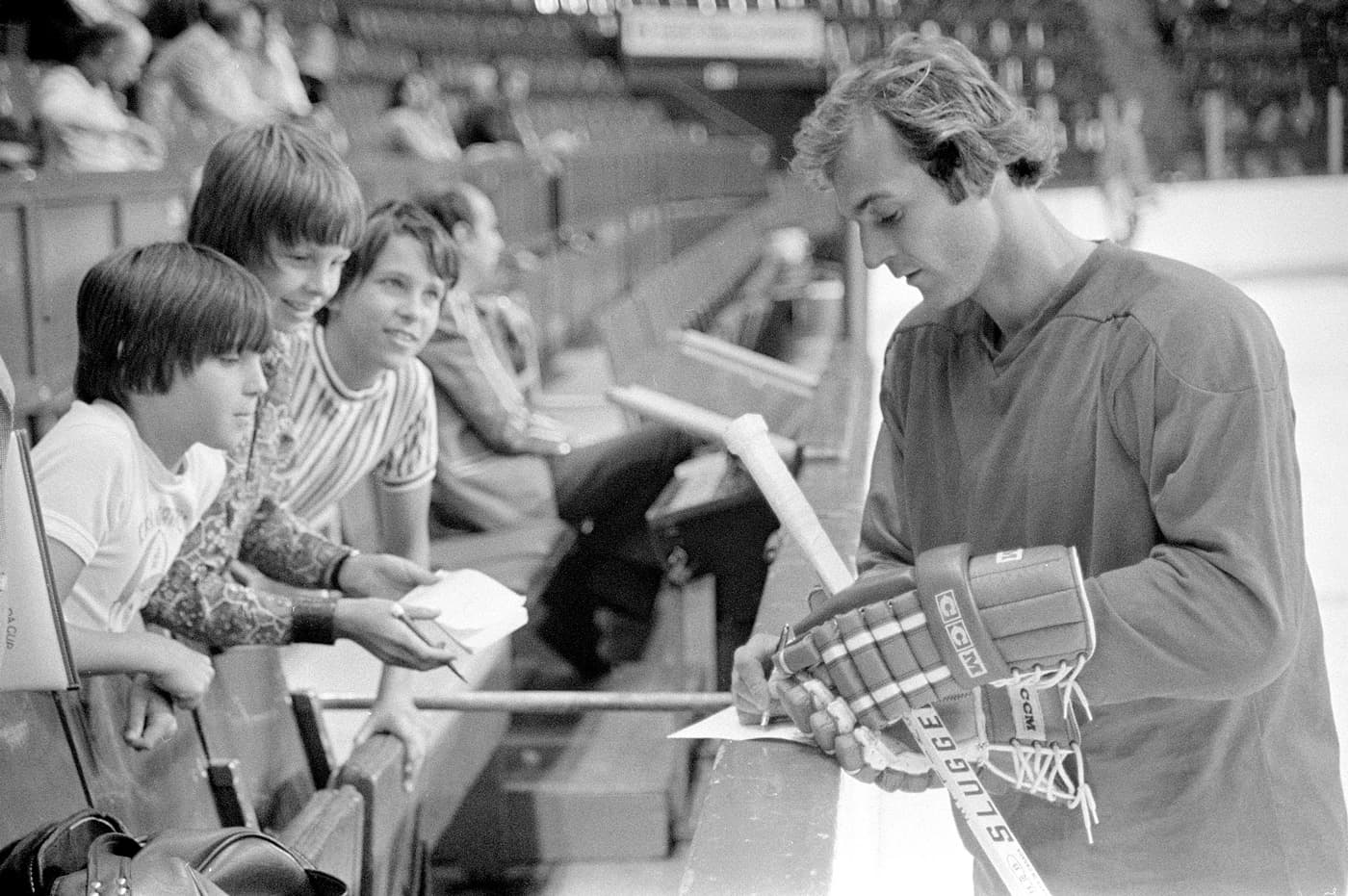 Guy Lafleur, alors membre de Team Canada, signe des autographes durant un entraînement pour la Coupe Canada, Montréal 1976 Denis Brodeur / NHLI via Getty Images