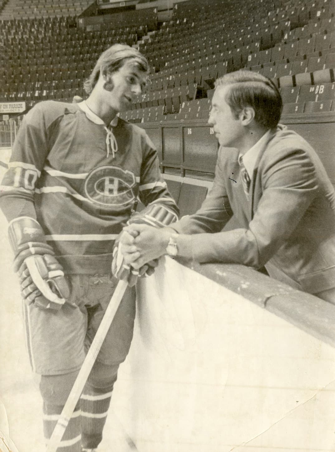 11 septembre 1971 - À la veille de son premier camp d'entrainement avec le Canadien de Montréal, pour la première fois Guy Lafleur en profite pour donner quelques coups de patin sur la patinoire du Forum. Sur la photo il est en compagnie de Jean Béliveau. Les archives / Le Journal de Montreal