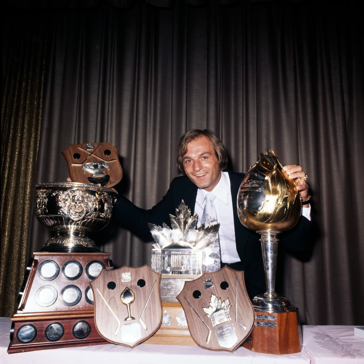 Guy Lafleur et les trophée Art Ross, Conn Smythe et Lester B. Pearson, Forum de Montréal, 1976 Denis Brodeur / NHLI via Getty Images