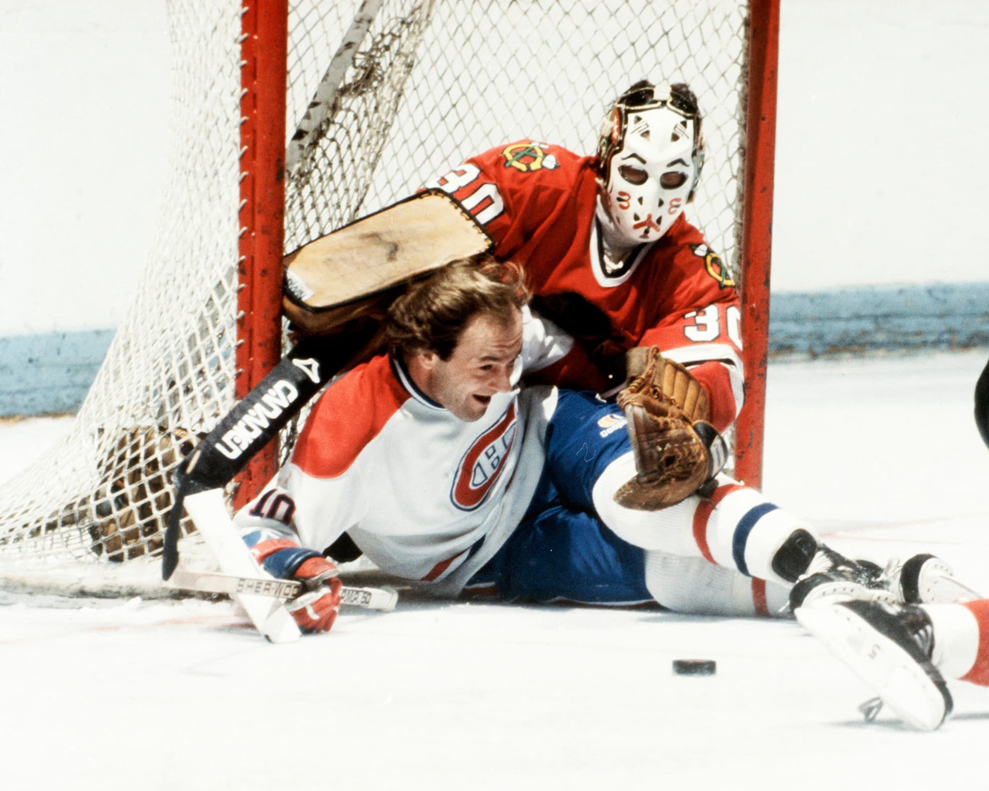 Guy Lafleur et le gardien de but Murray Bannerman #30 des Blackhawks de Chicago, Forum de Montréal 1980 Denis Brodeur / NHLI via Getty Images