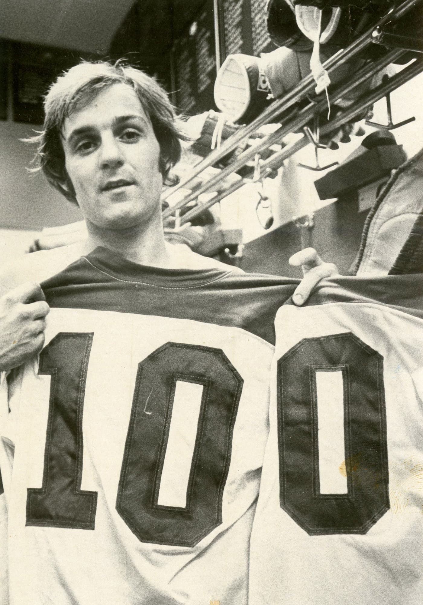 7 mars 1975 - Guy Lafleur devient le premier joueur de toute l'histoire du club Canadiens à atteindre les 100 points en une seule saison Lors d'une victoire de 8 à 4 contre les Capitals de Washington Les archives / Le Journal de Montreal
