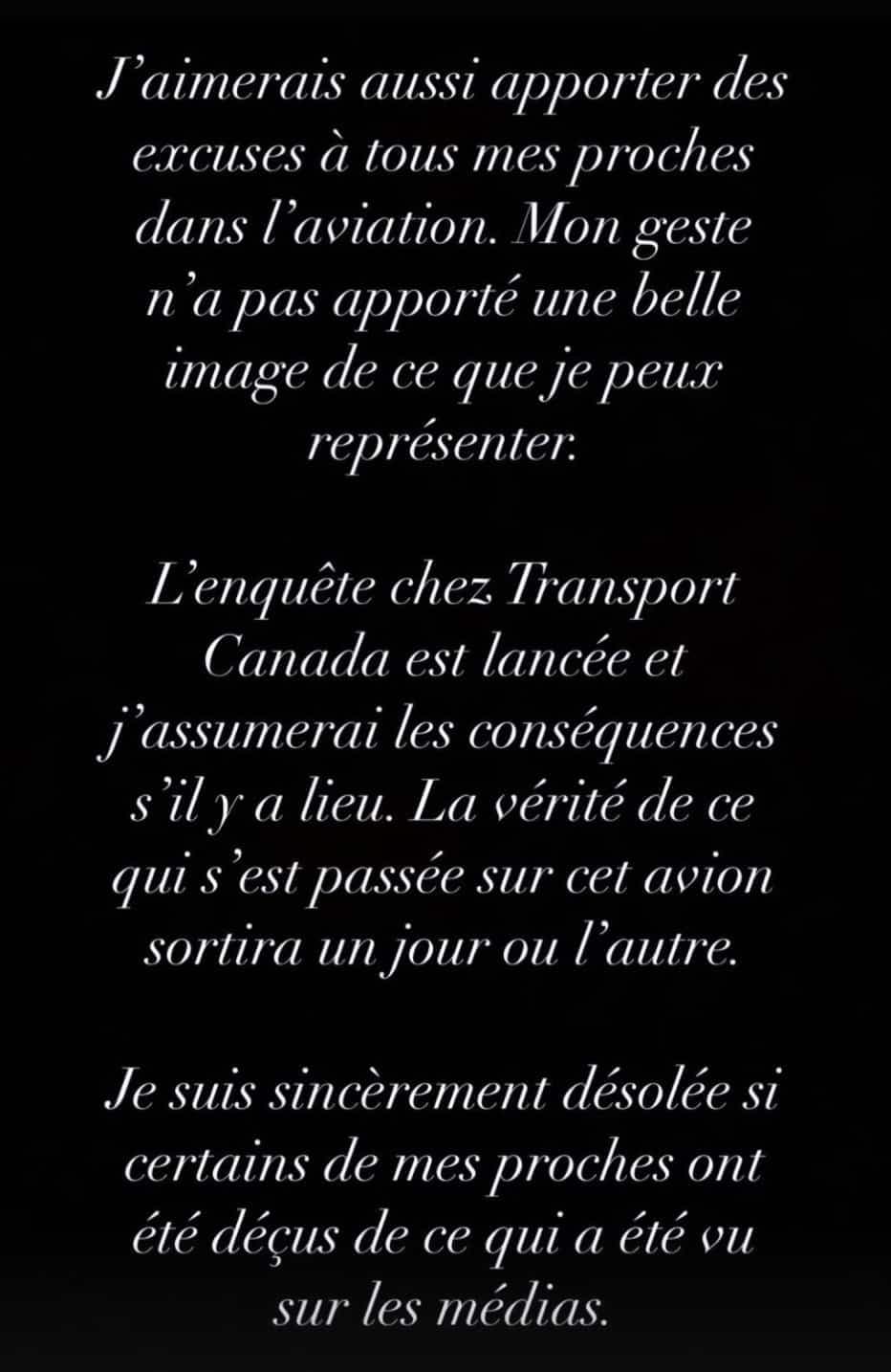 «L’enquête chez Transports Canada est lancée et j’assumerai les conséquences s’il y a lieu. La vérité de ce qui s’est vraiment passé sur cet avion sortira un jour ou l’autre», écrit-elle.