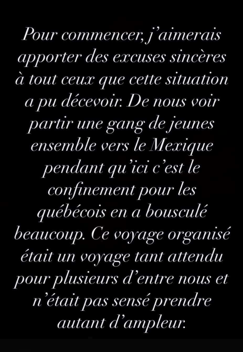 «Pour commencer, j’aimerais apporter des excuses sincères à tous ceux que cette situation a pu décevoir. De nous voir partir une gang de jeunes ensemble vers le Mexique pendant qu’ici c’est le confinement pour les Québécois en a bousculé beaucoup», peut-on lire dans un message qu’elle a publié mardi sur son compte Instagram.