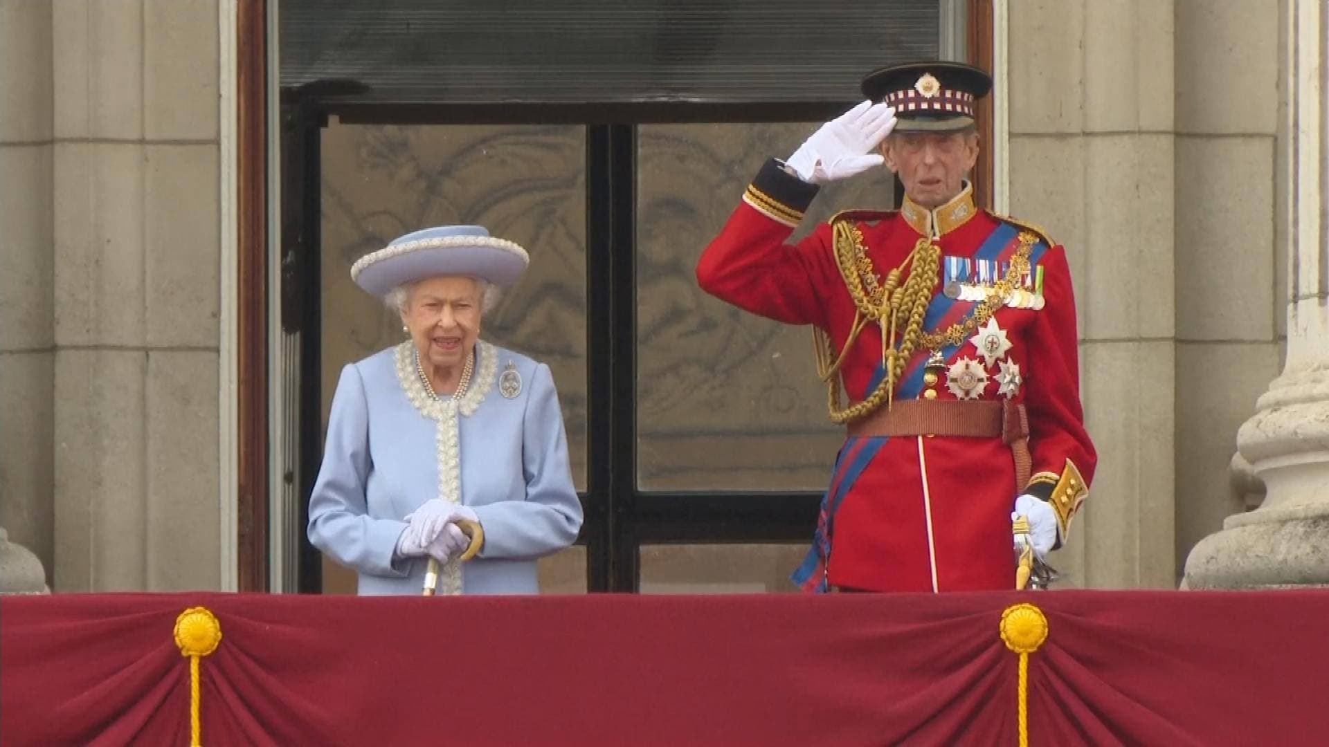 La reine, montée sur le trône à 25 ans le 6 février 1952 à la mort de son père, George VI, est sortie sur le balcon, vêtue d’un ensemble bleu tourterelle, s’appuyant immobile sur une canne. Elle était accompagnée du duc de Kent, un cousin, pour le passage de la parade annuelle du Salut aux couleurs réunissant plus de 1200 soldats et des centaines de musiciens.