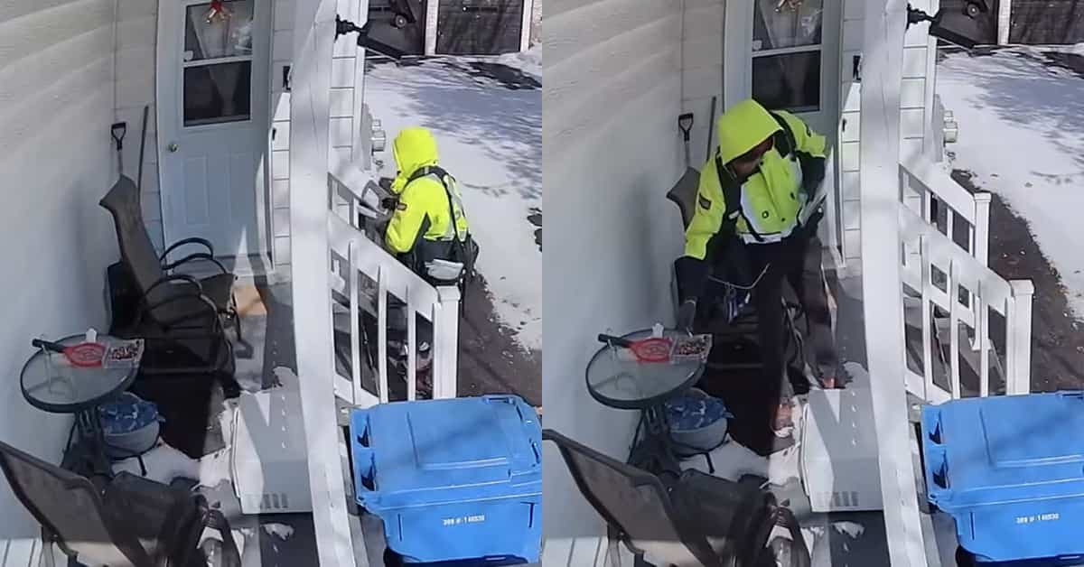 Dans l'extrait de quelques secondes partagé sur le groupe Facebook le 8 mars dernier, on peut voir un facteur de Postes Canada en train de saisir une cigarette dans un cendrier sur un balcon, au moment de livrer une lettre.