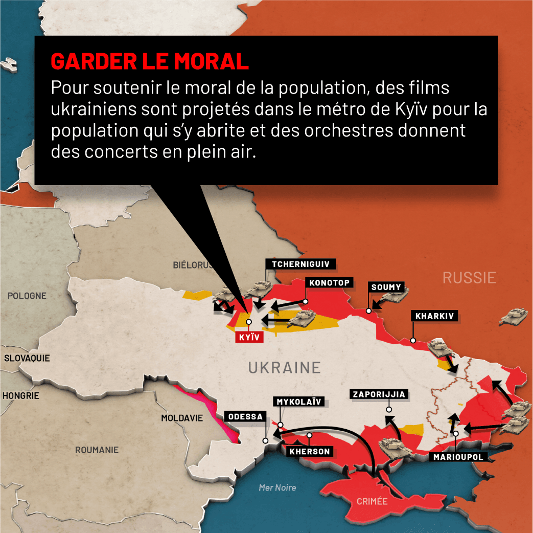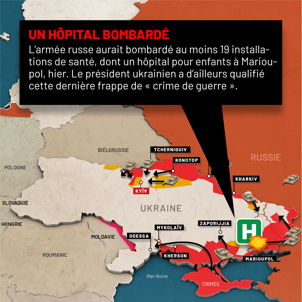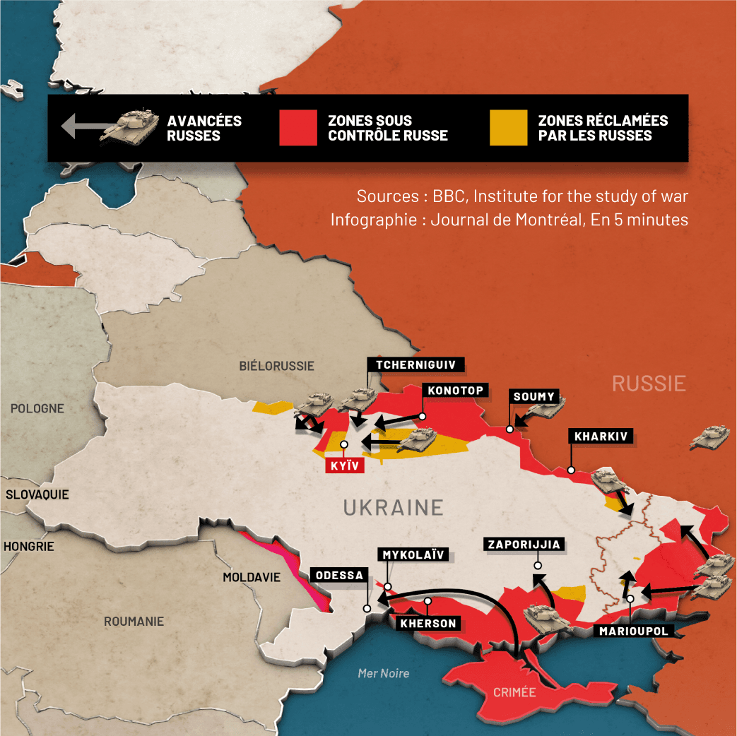 Les Russes ont fait peu d’avancées significatives. Ils semblent consolider leurs forces en vue d’attaques sur trois grandes villes : Kyïv, Odessa et Zaporijia.
