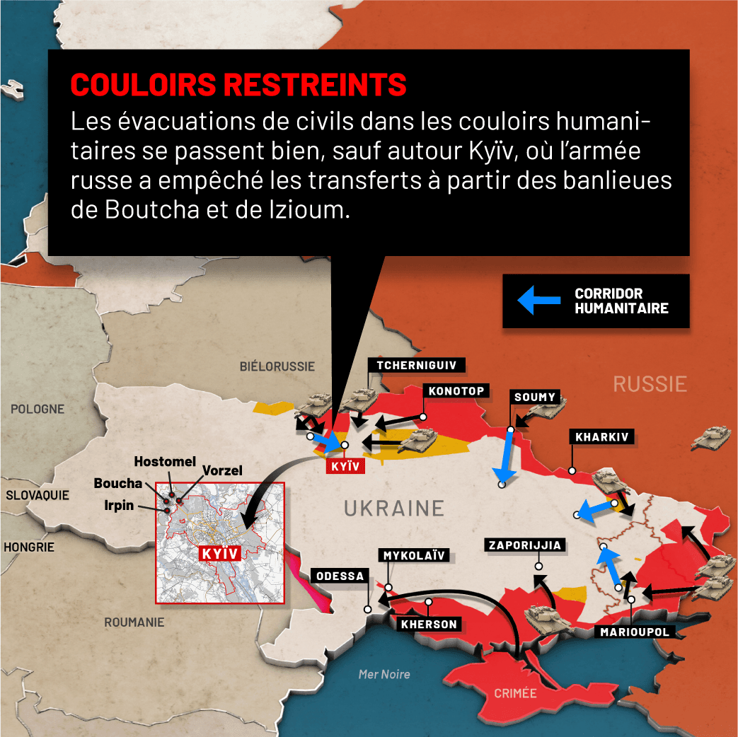 Par ailleurs, les corridors d’évacuation fonctionnent généralement bien, sauf autour de Kyïv.