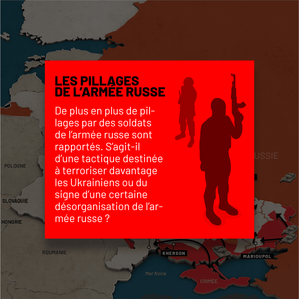 L’image des troupes russes continue à se détériorer. Elles ont la réputation de se livrer à des pillages dans les maisons et dans les magasins et en plus, elles ont attaqué des installations médicales, dont un hôpital pour enfants.