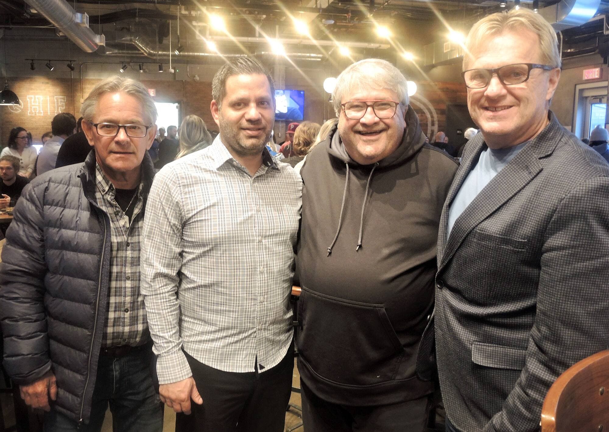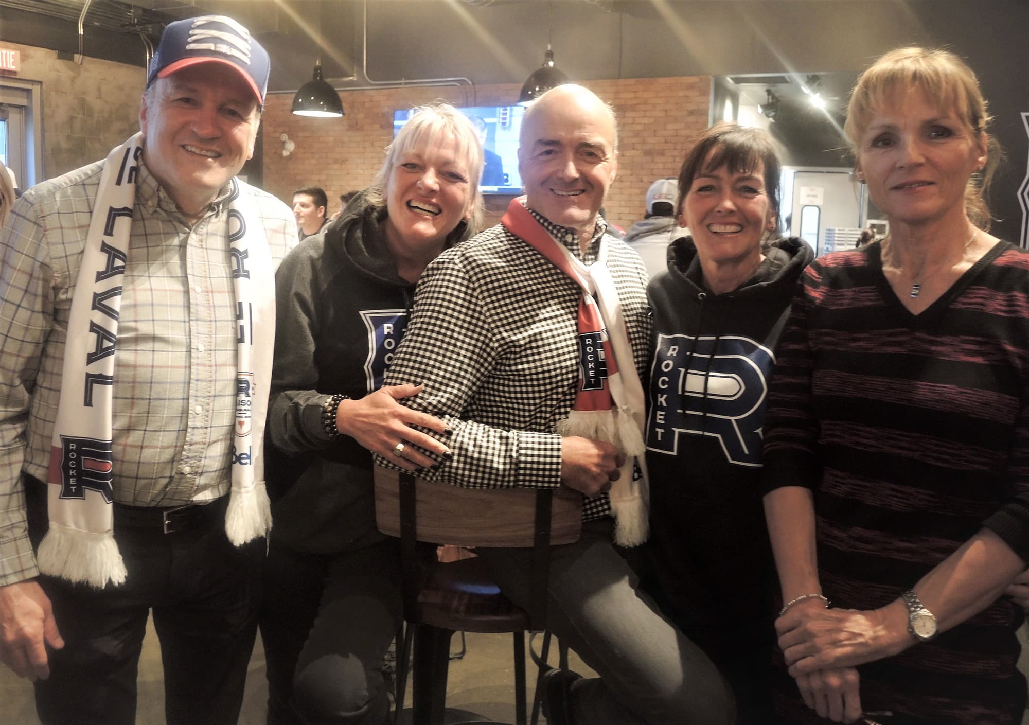 Le directeur de la Cage Place Bell, John Tyrovolas, deuxième de la gauche, est entouré de fiers partisans du Rocket : Pierre Balleur, Guy Goyer et Daniel Desjardins, de la région de Sainte-Agathe.