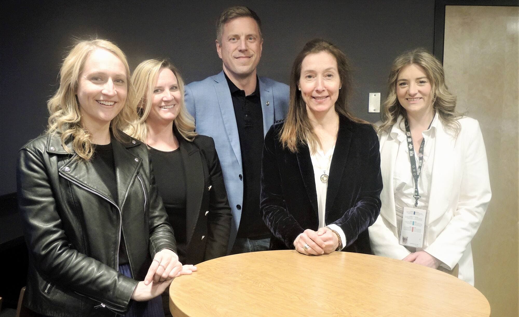 France Margaret Bélanger, présidente du Groupe CH, quatrième de la gauche, est entourée des membres de son équipe, Claudiane Tremblay, Shauna Denis, John Trzcienski et Noala Beattie-Dagenais.