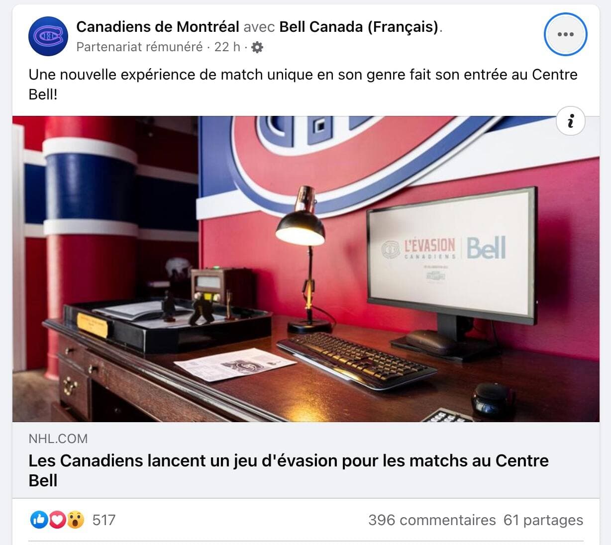Le Canadien de Montréal a annoncé, ce mercredi, l’ouverture d’un jeu d’évasion lors de ses parties à domicile.