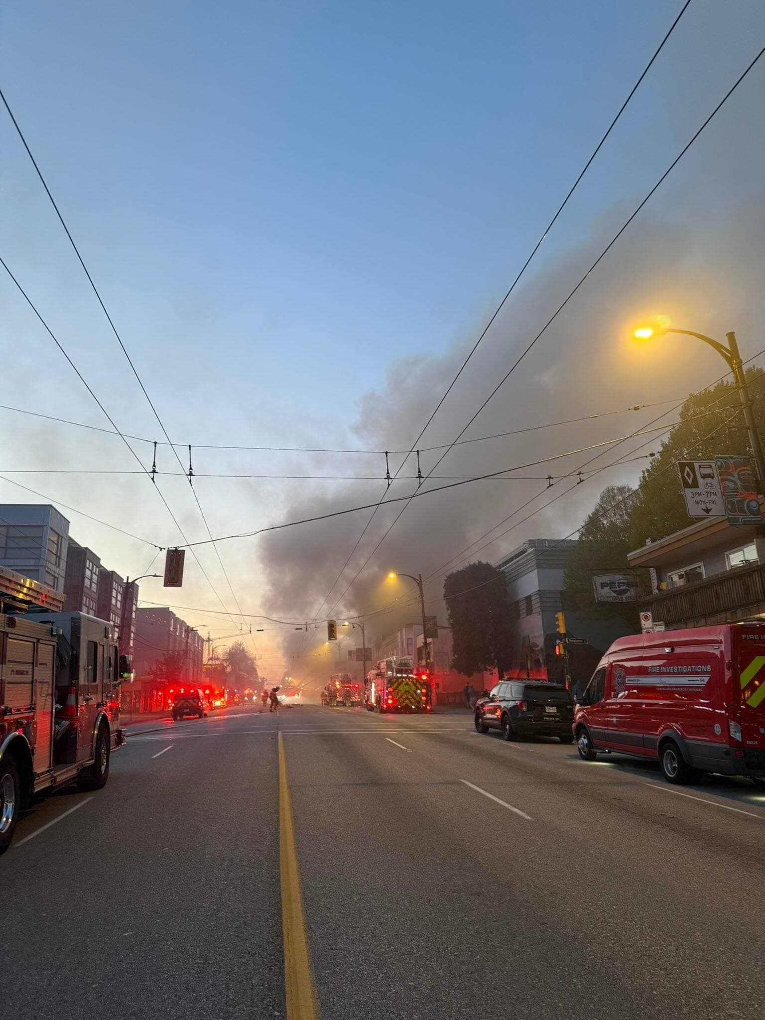 «Des pompiers sont sur les lieux en train de combattre un incendie de 3e alarme à l’intersection des rues E Hastings et Nanaimo. D’importants ralentissements de la circulation sont à prévoir dans le secteur», a écrit le service de sécurité incendie de Vancouver sur son compte X, un peu avant 9h.