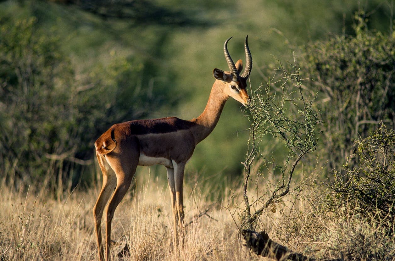 Gérénuk La gérénuk s’appelle aussi la gazelle de Waller, ou antilope girafe, ou gazelle-girafe. Elle vit principalement en Éthiopie, Djibouti, au Kenya, en Somalie, et en Tanzanie.
