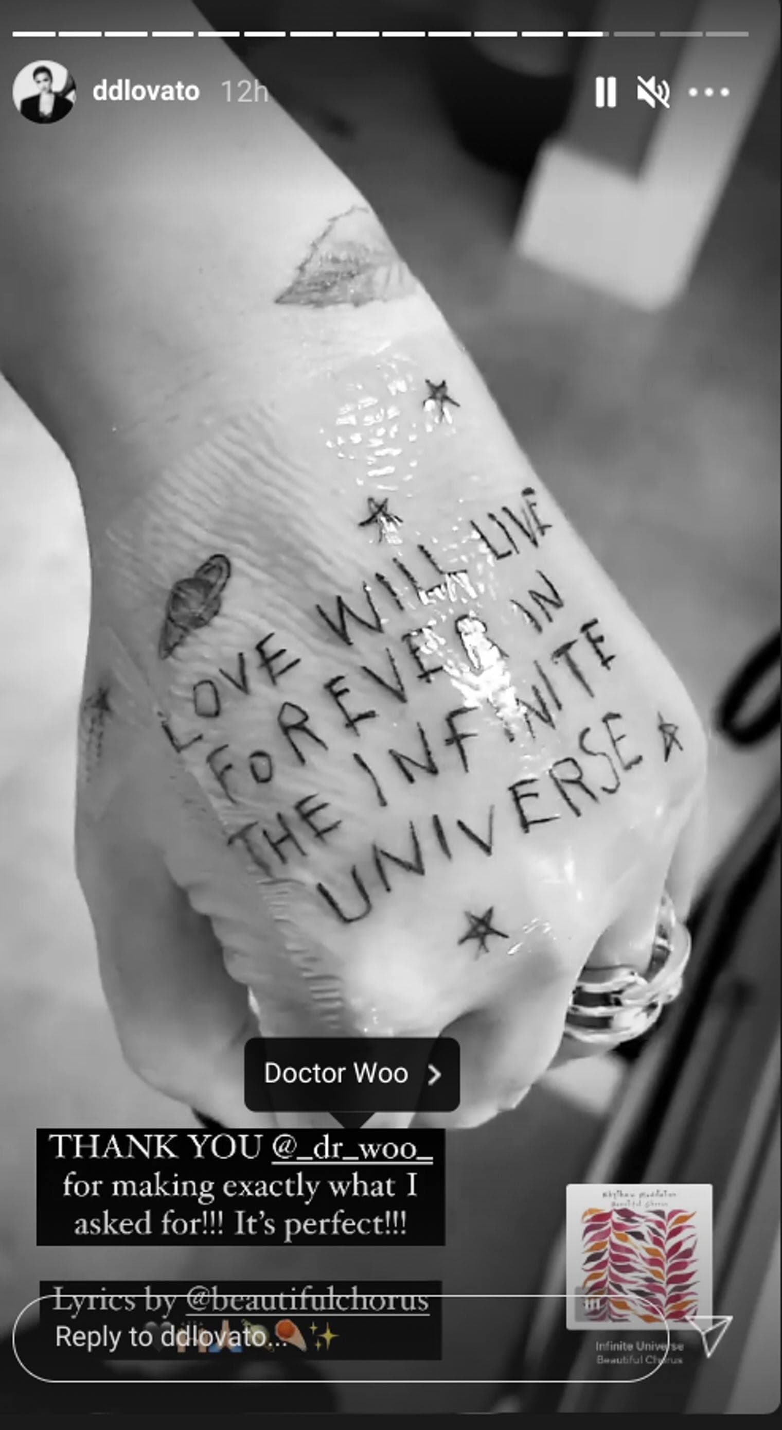 Demi a opté pour des paroles de la chanson Infinite Universe par le groupe musical Beautiful Chorus. On peut y lire la phrase Love will live forever in the infinite universe, qu’on pourrait traduire par L’amour va durer pour toujours dans l’univers infini.