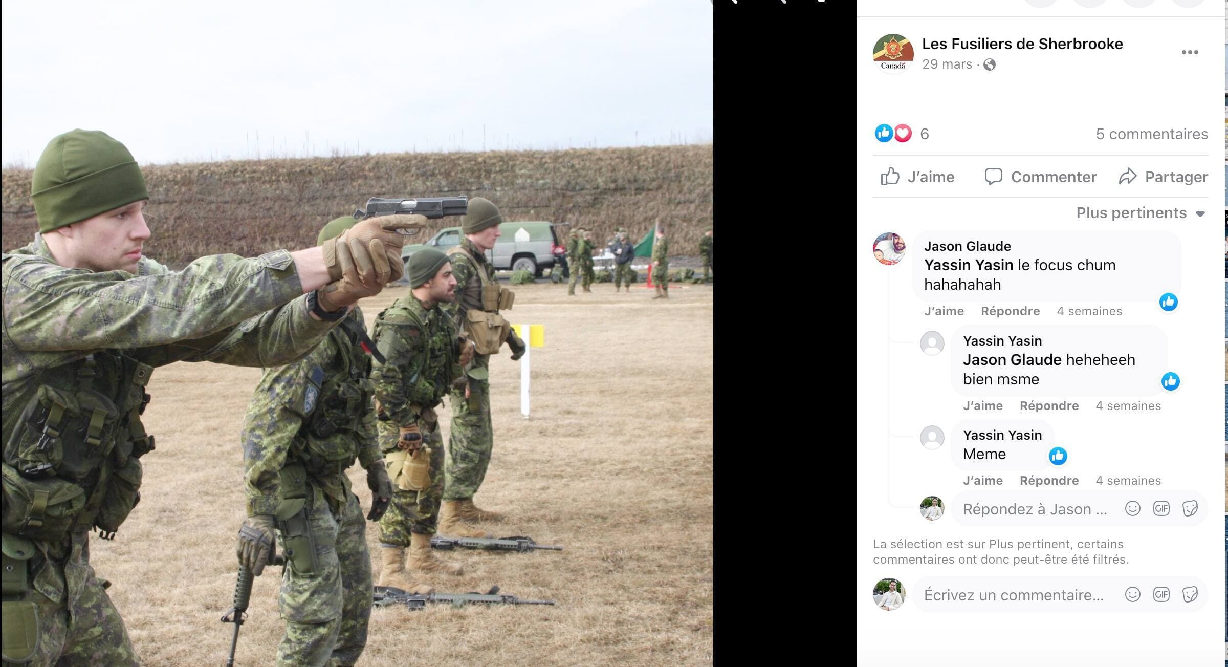 « La chaîne de commandement du membre a été avisée. On regroupe de l’information et on est en train d’analyser la situation », mentionne brièvement par courriel Zahida Assari, des Forces armées canadiennes.