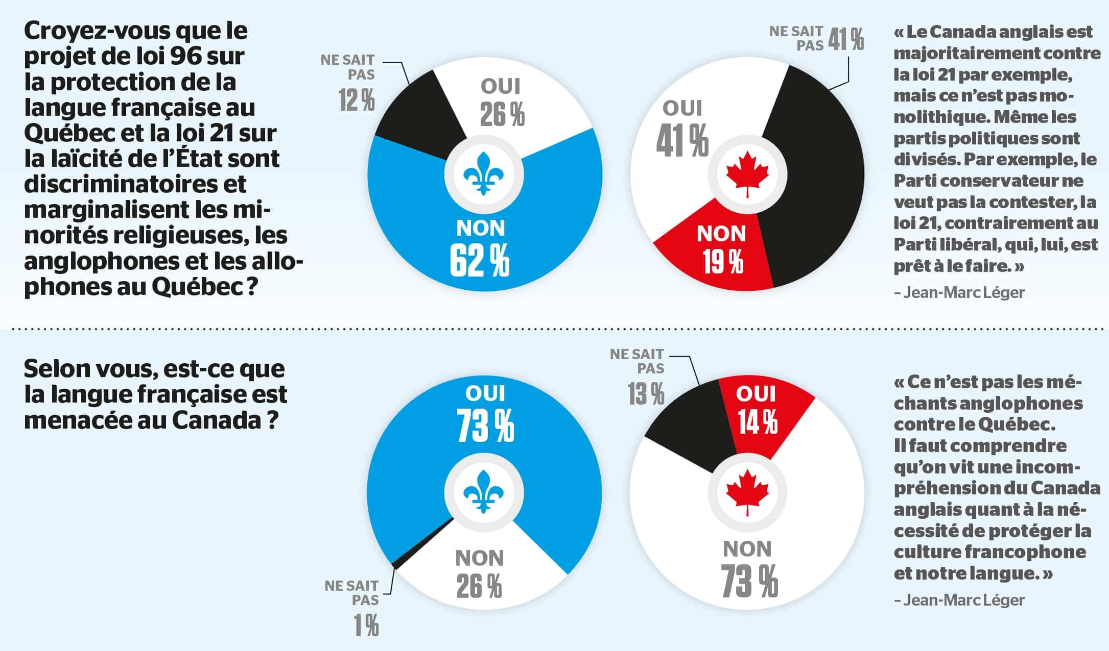 « Au Québec, on en a assez des critiques. Même chose au Canada anglais, 44 % des gens disent que ça n’a pas sa place, le Québec bashing, et ils ne sont pas confortables avec ça. Donc, ce n’est pas les méchants anglophones contre le Québec. [...] Ils ne comprennent simplement pas les enjeux liés à la protection de la culture francophone », conclut Jean-Marc Léger.