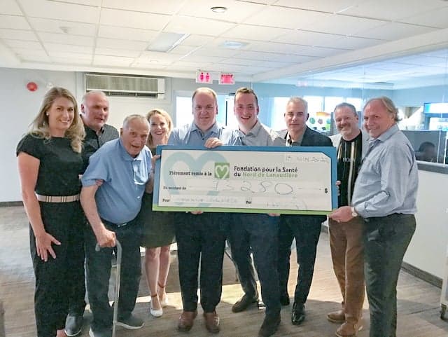 Renelle Nicoletti, de la Fondation, est accompagnée de Lucien Deblois, Marcel Bonin, Maude Malo, de la Fondation, Alain Chalut, président de A. Chalut Auto, Alexandre Chalut, Dominique Ducharme, François Hamel et Michel Beaudry.
