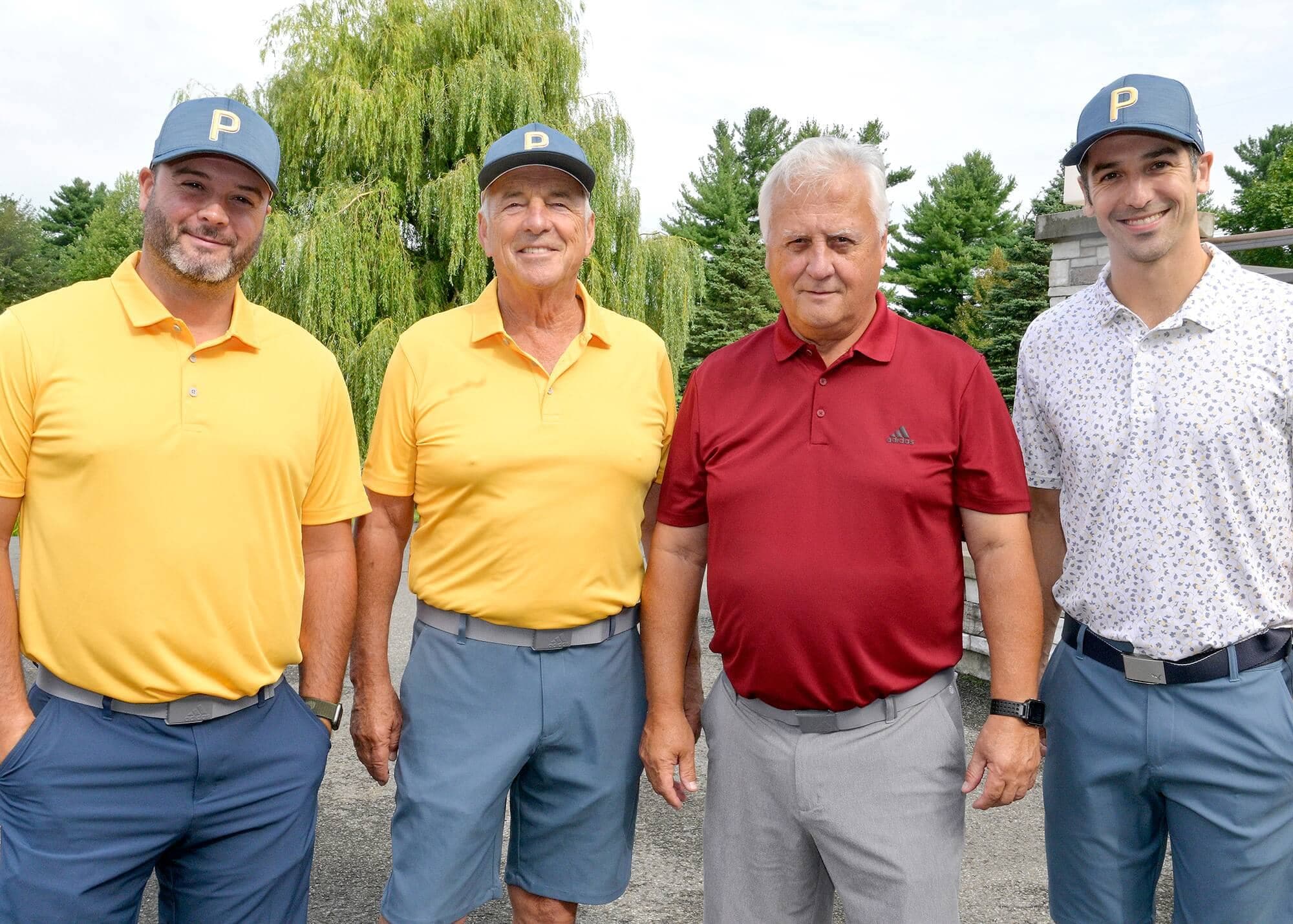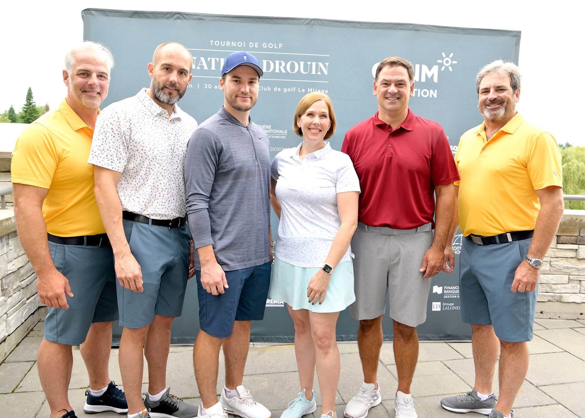Le président d’honneur du tournoi, Jocelyn Hogue, de Toitures Hogue, est en compagnie de Martin Lafleur, Jonathan Drouin, Pascale Bouchard, la PDG de la Fondation du CHUM, Pascal Tremblay et Marc Tremblay, le président du CA de la Fondation.