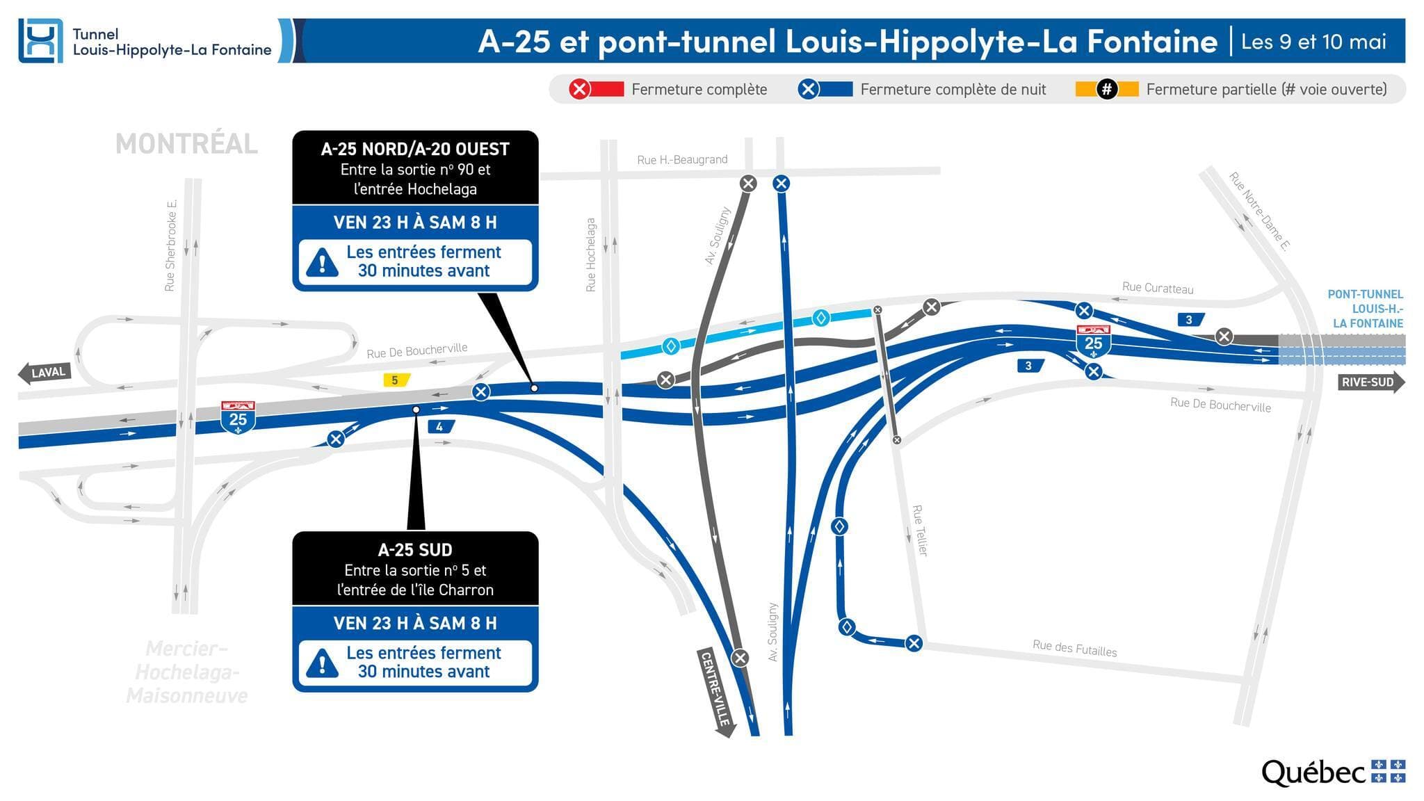 Ainsi, l’autoroute 25 en direction de Montr.al sera fermée entre la sortie 90 et l’entrée en provenance de la rue Hochelaga, de vendredi 23 h à samedi 8 h.