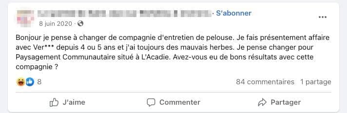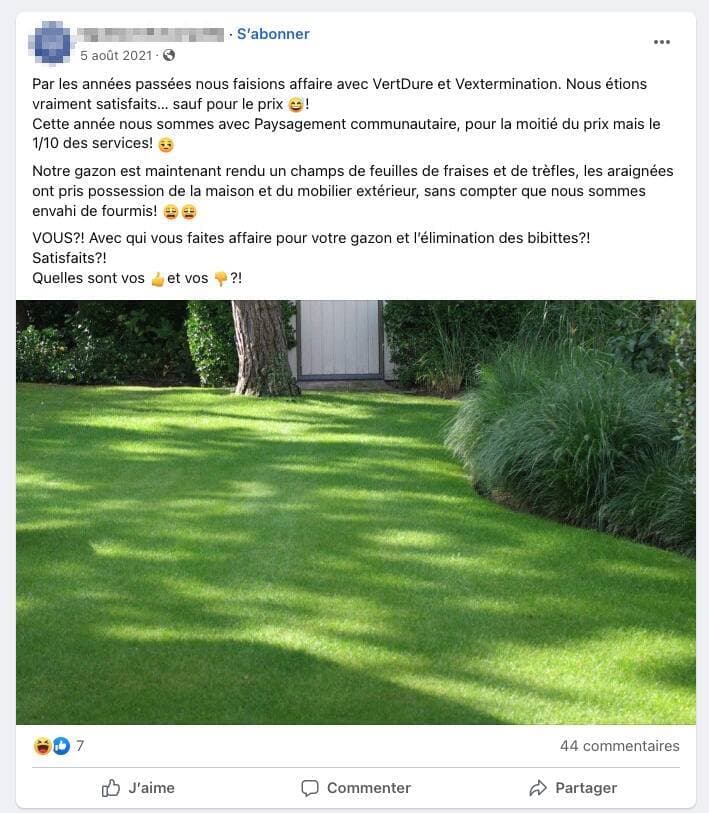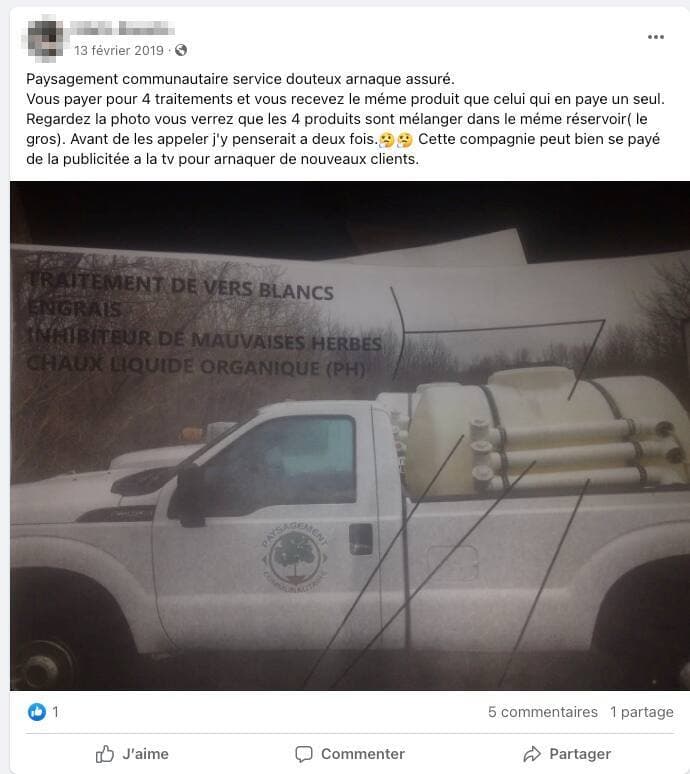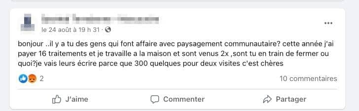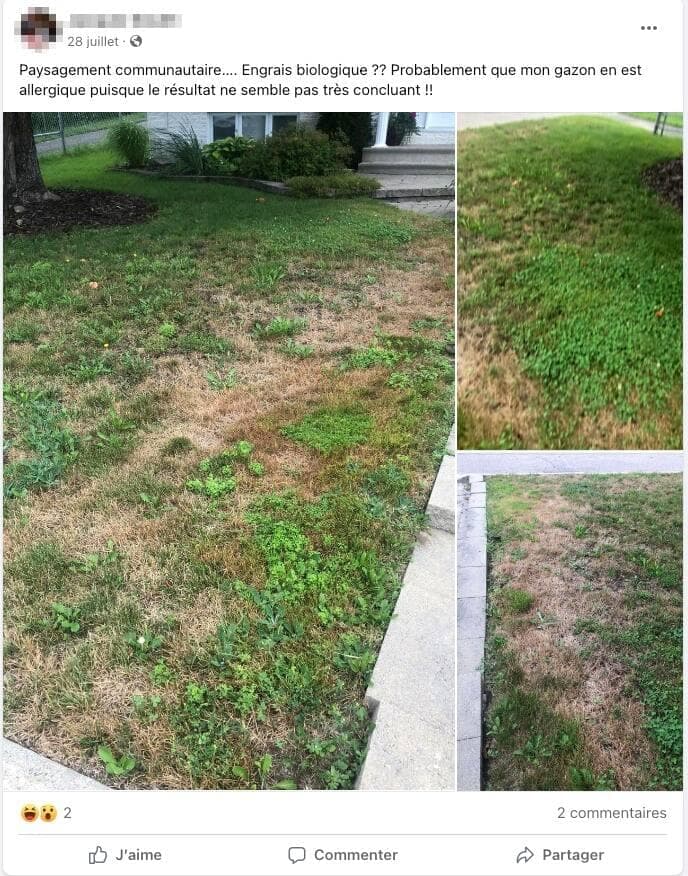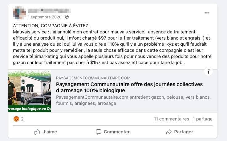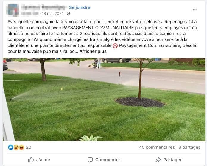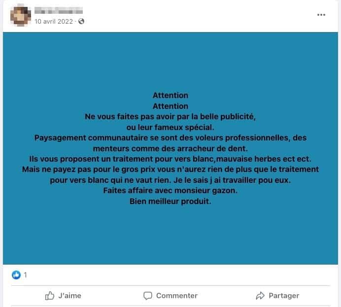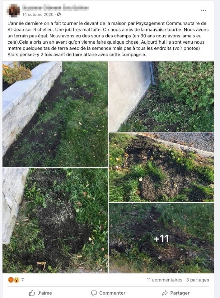 « J’ai donné un contrat pour traiter mon gazon à Paysagement Communautaire. Résultat : mon gazon n’a jamais été aussi laid et plein de mauvaises herbes depuis 53 ans. Méfiez-vous », écrit l’un d’entre eux.