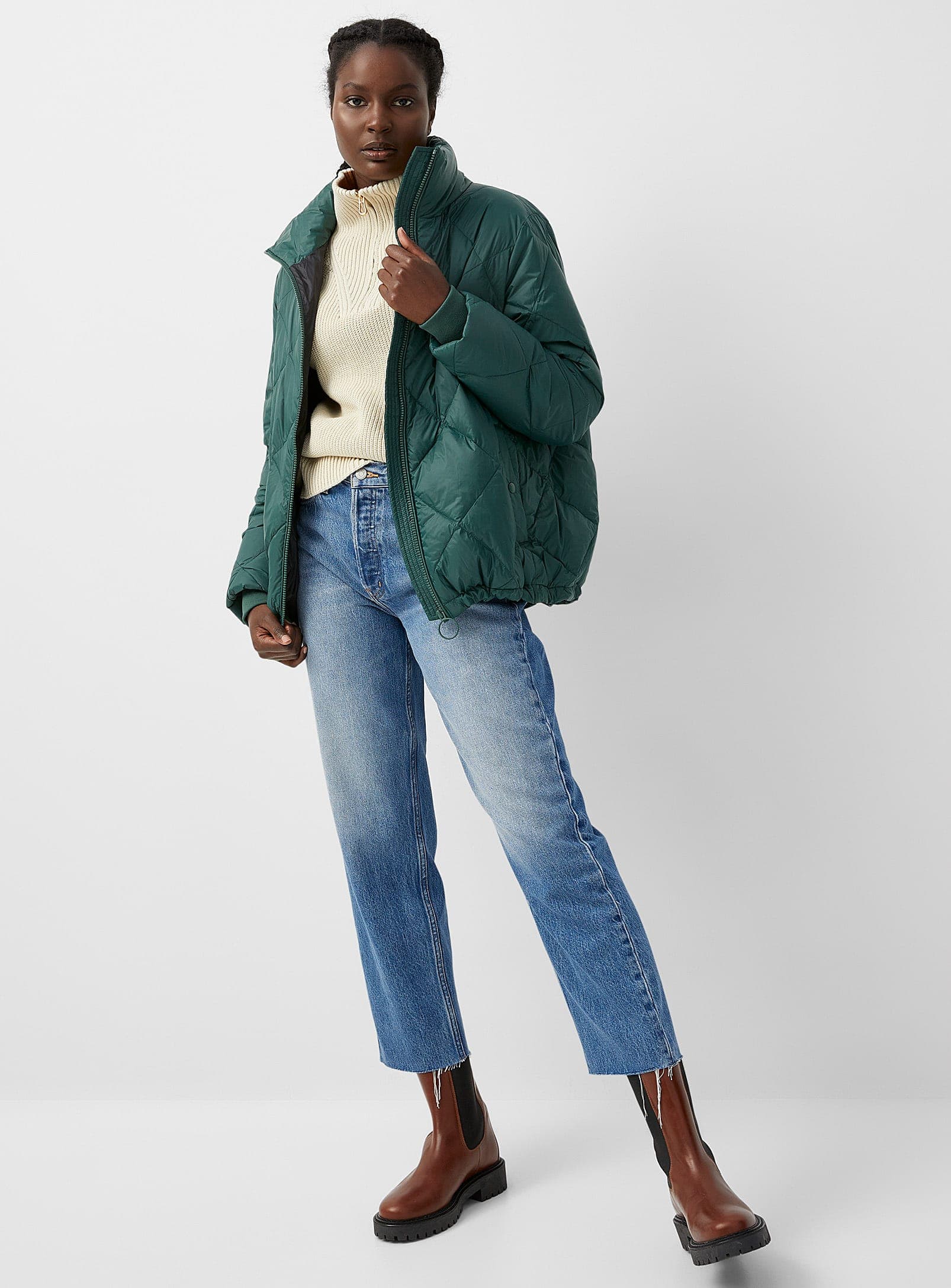Le bomber, qu’il soit matelassé ou en cuir, est probablement LE manteau le plus en vogue pour l’automne. Son style sportif peut être rehaussé si on l’agence avec un pantalon habillé.
